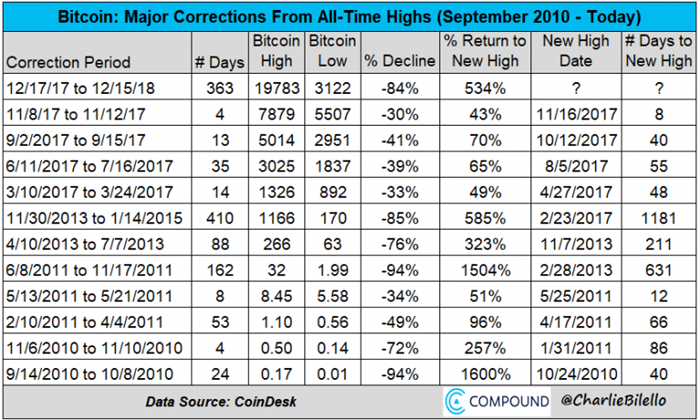얼마 지나지 않아, 아시다시피 비트코인이 다시 한번 추락했다. 이번에는 2018년 12월 저점을 기록하기까지 84% 하락했다.