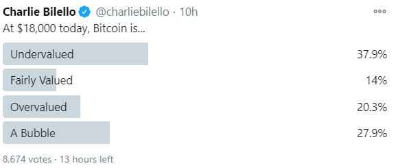 트위터에서 한 여론조사에 따르면, 응답자 중 37.9%가 비트코인이 아직 저평가되어 있다고 답했고, 27.9%는 거품이라고 불렀다.