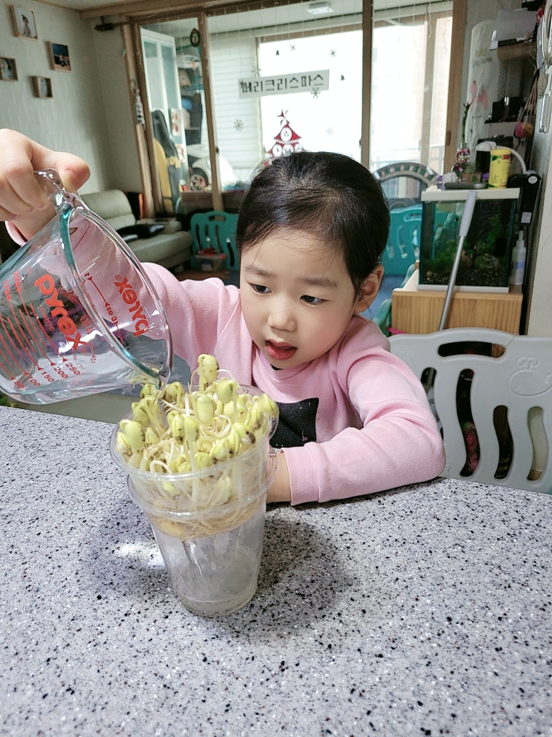 요즘 둘째아이는 유치원에서 나눠준 가정학습도구중 콩나물 기르기에 푹 빠져있습니다😁