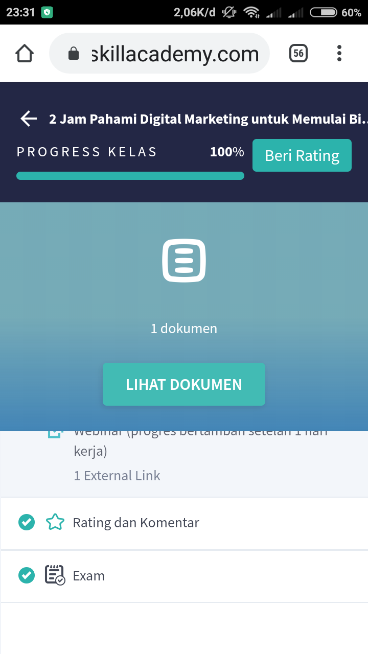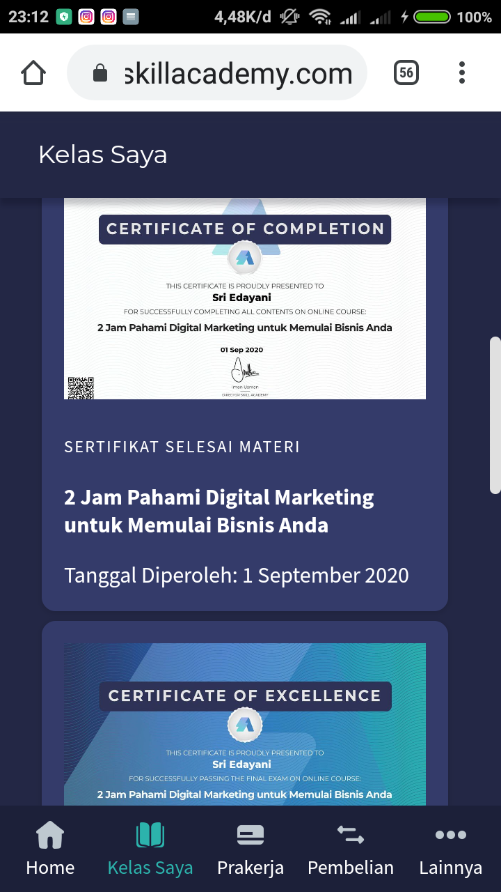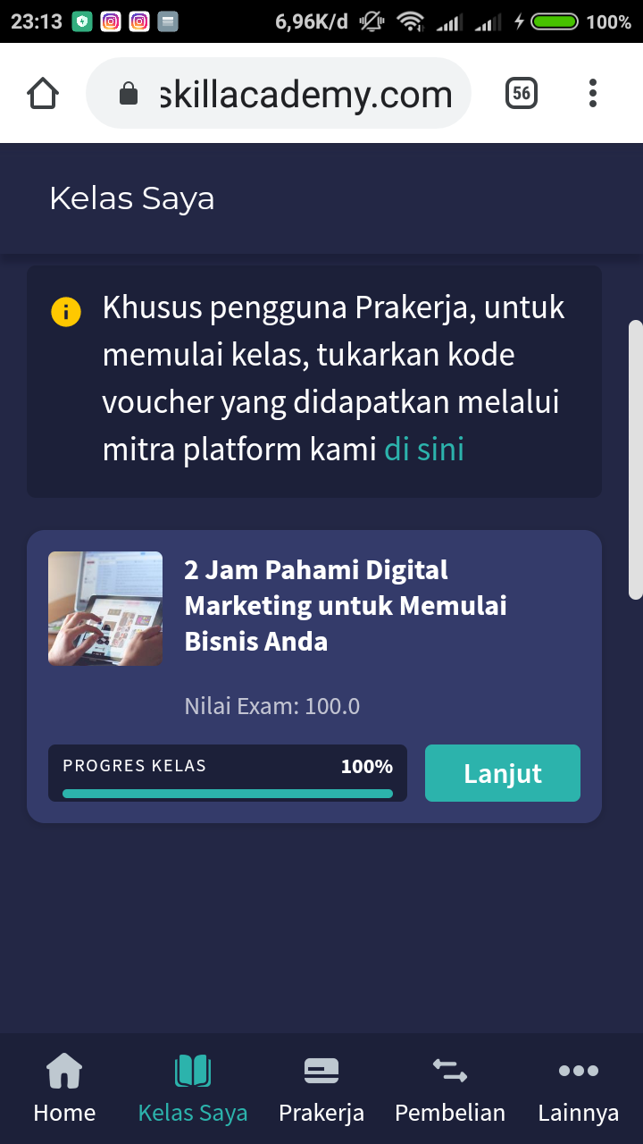 Selamat Malam Kawan Kawan Semua di postingan saya kali ini saya akan tampilkan Schrenshot Program Platihan saya di prakerja, saya menggunakan platform Skill Akademi. Dan Alhamdulillah berjalan dengan lancar, Saya mendapatkan Nilai 100 😱😱. MANTAPPP..