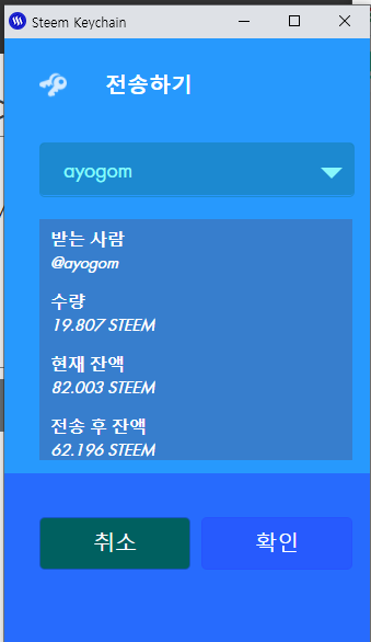 하지만 키체인에 연동된 변경된 시스템의 경우 send steem을 누르면 키체인으로 연결됨을 알 수 있습니다.