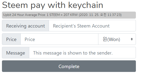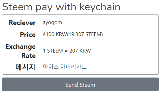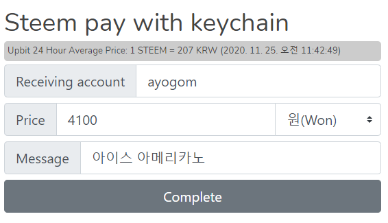 그러면 상단에 보이는 "Upbit 24 Hour Average Price: 1 STEEM = 207 KRW (2020. 11. 25. 오전 11:42:49)" 에 따라 4100원을 스팀으로 계산하게 됩니다. 24시간 내 평균 가격으로 계산되어 있으므로 급변한 시세 변동시에는 그에 따른 손실이 있을 수 있습니다.