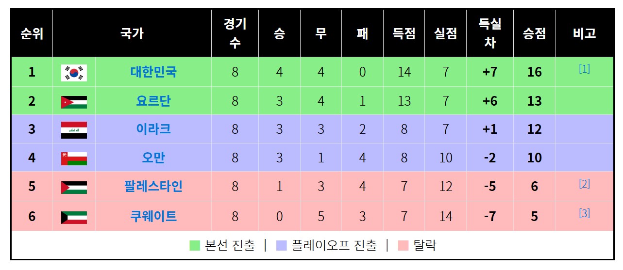 한국 승점 16점, 이라크 승점 15점, 요르단 승점 13점, 오만 승점 13점이 되고...