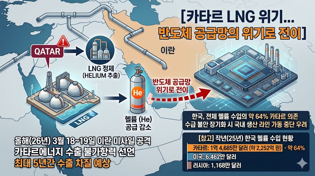 이란 미사일 공격으로 인해 카타르에너지는 LNG 수출 불가항력 선언 및 최대 5년간 수출 차질이 예상됨에 따라서 에너지 위기를 넘어 반도체 공급망 핵심 자원인 "헬륨 수급"에도 비상이 걸렸습니다.