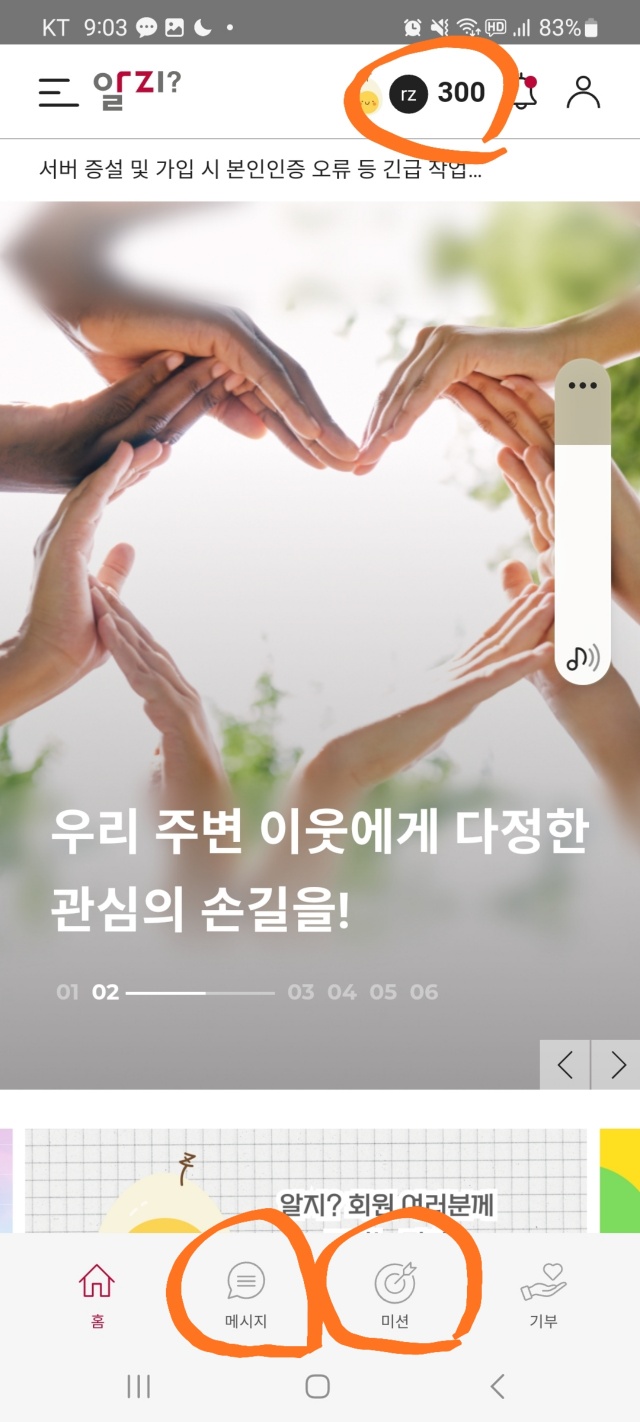 위에 포인트가 나타나고, 아래는 메세지와 미션이 있는데요.