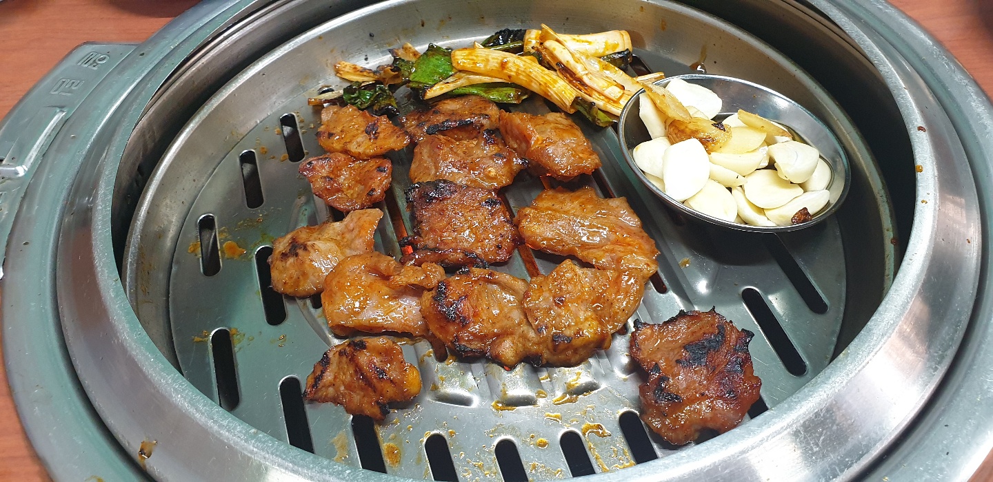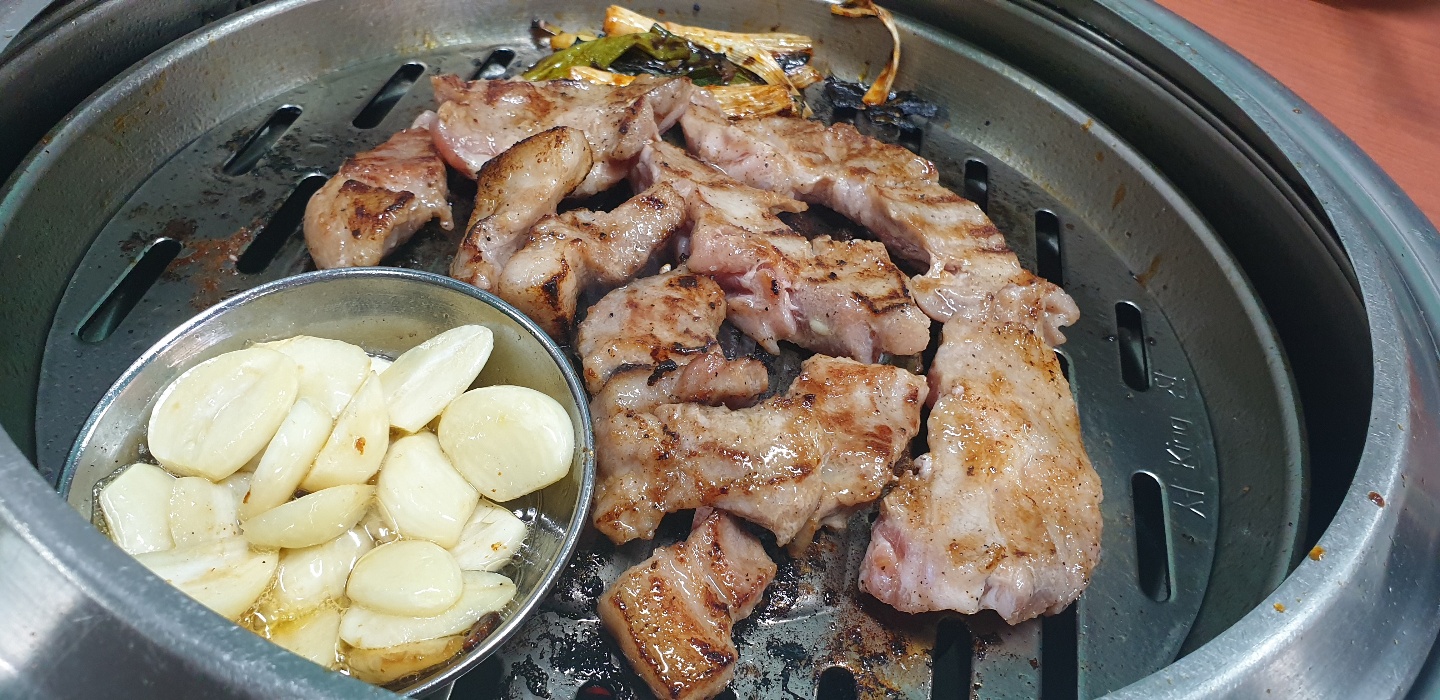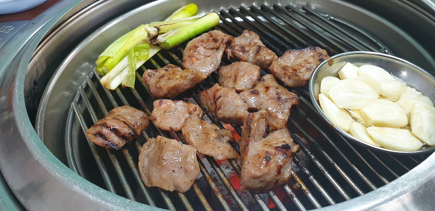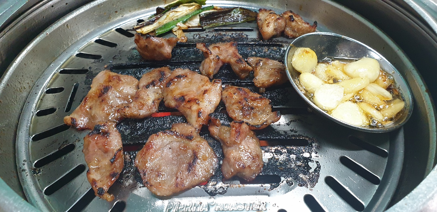 숯으로 고기가 구워지고 불판 위에는 마늘이 노릇노릇 구워져요.