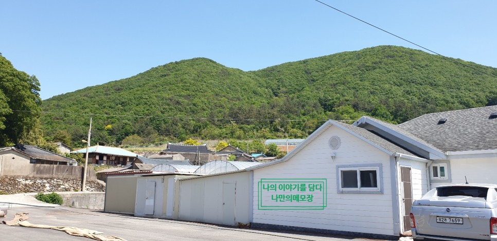 뒤편은 푸릇푸릇 한 산이 있으며 이쁜 집들이 있지요~