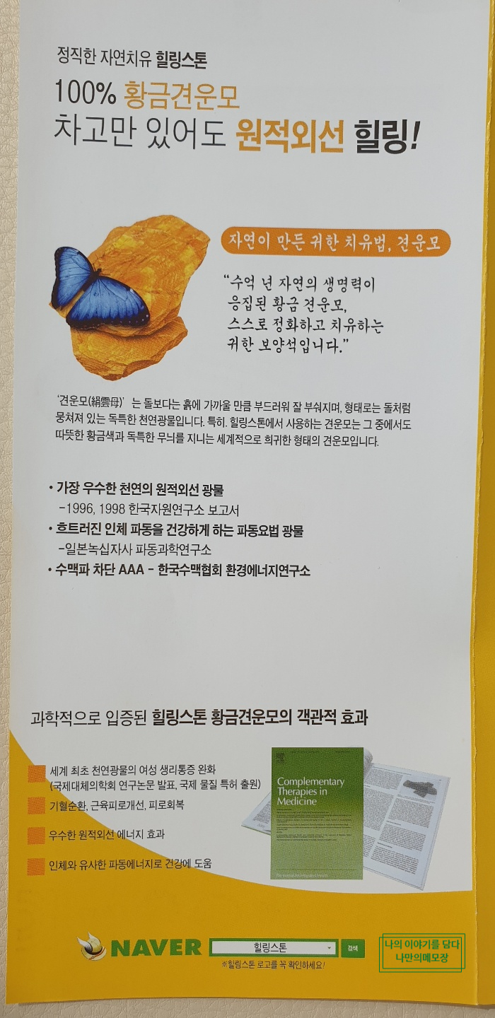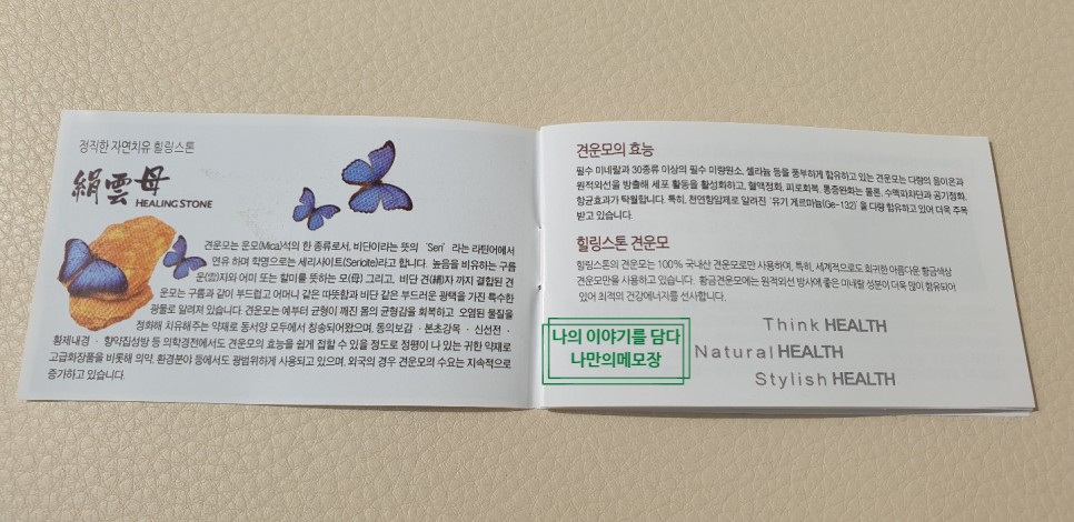 안내 책자에는 간단한 견운모라는 설명과 힐링스톤이 과학적으로 입증이 된 것의 자료가 적혀있습니다.