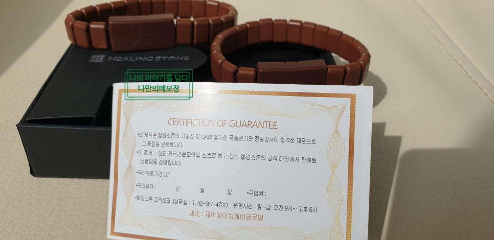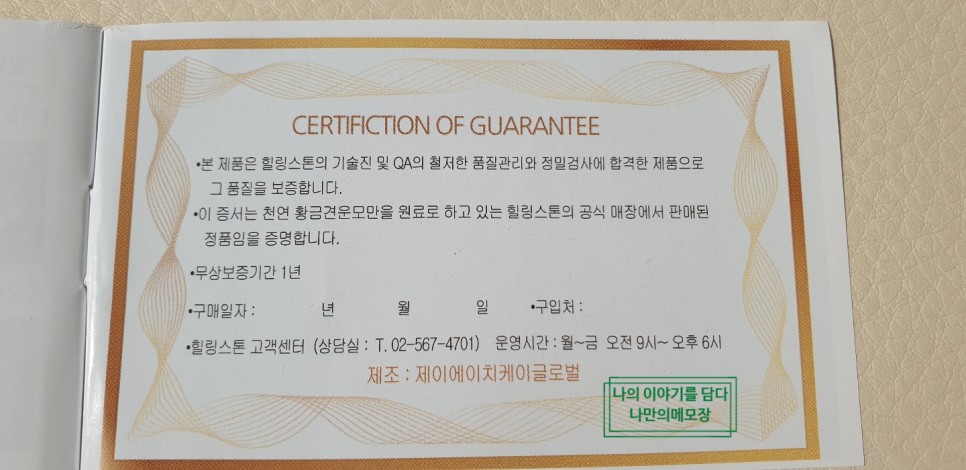 힐링스톤은 구매를 하시면 작은 책자 맨 뒤쪽에 보증서 있으며
