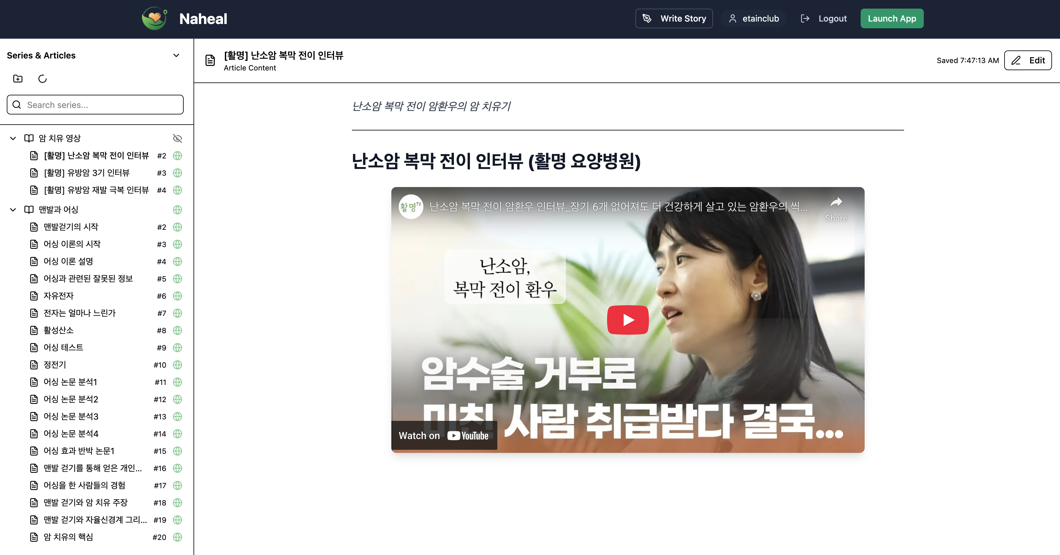 [Naheal] 하나 하나씩 자연 암치유 자료를 모아간다etainclub (79)Beyond Reality Researcherin Korea • 한국 • KR • KO • 6 months ago https://naheal.org/series/zsG5JU1VNNrNfUfiXmzU 지금까지 올린 글과 영상들 편집화면 암 치유 영상 모음 Posted through the ECblog app (https://blog.etain.club) #kr #naheal #cancer #healing #ecblog