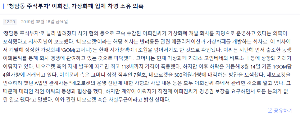 고머니2는 과거 청담동 주식부자로 알려진 이희진이 차명으로 운영하고 있다는 의혹이 있었지만 공식 채널에선 어영부영 넘어갔던 것으로 기억한다. 기사에서 확인할 수도 있지만 당시 상장되어 있던 "코인베네"에서 가두리를 시전하여 시가총액이 무려 1조 원이 넘었던 적도있었다.