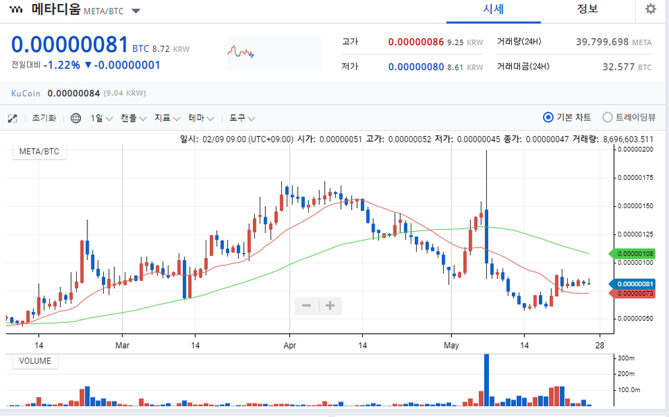참고로 메타디움은 빗썸 원화 마켓과 업비트 BTC 마켓에 상장되어 있습니다.