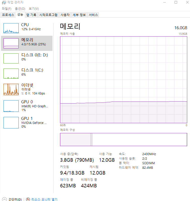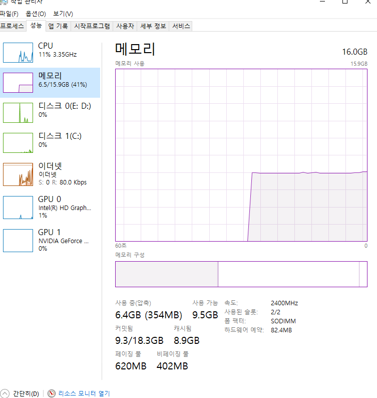 아래 사진은 6시간 동안 메모리 정리를 안한 내 자원 상태