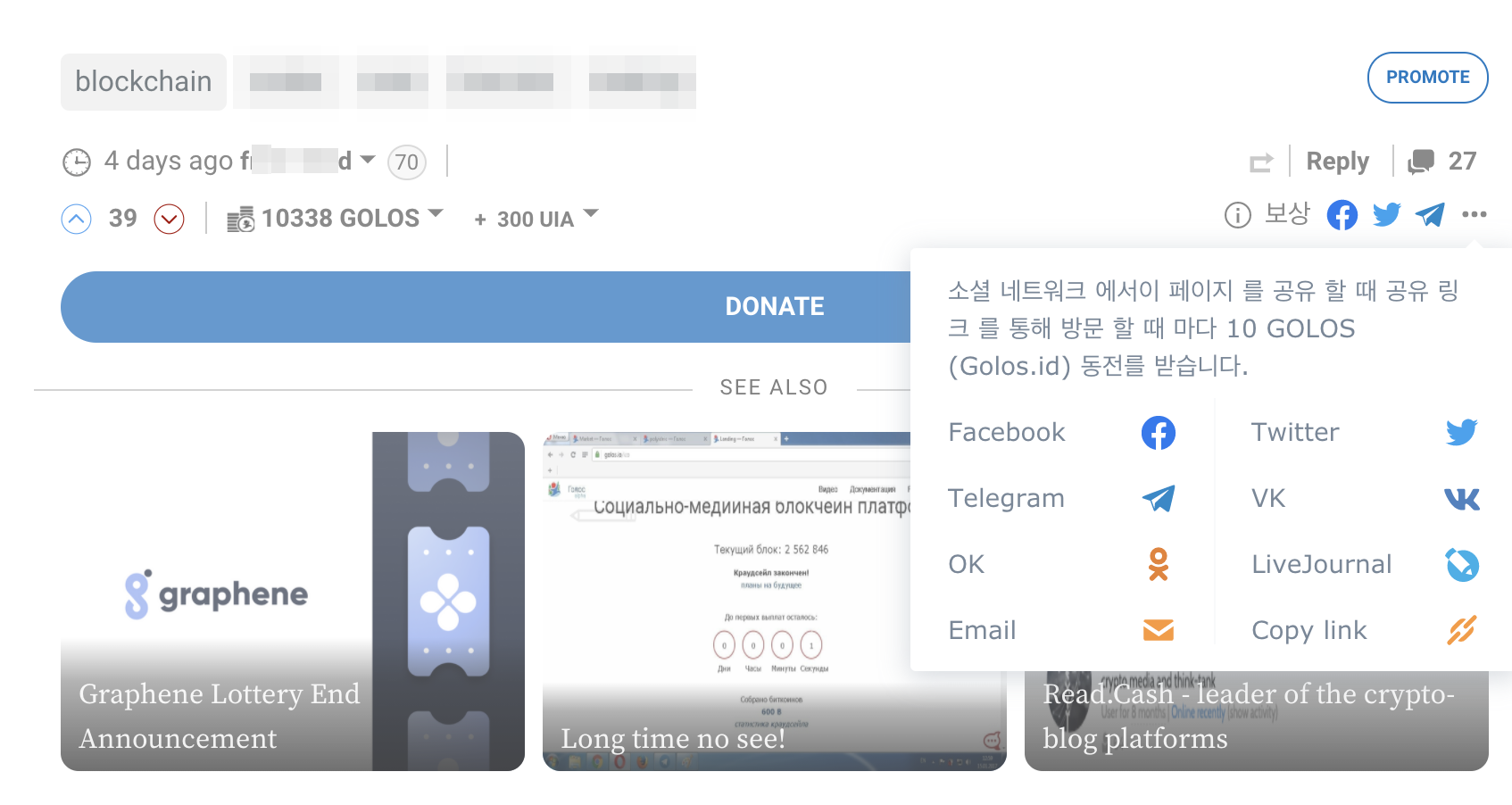 - 골로스 포스팅을 기타 SNS에 공유 후 누군가 그 링크를 통해 방문시 10골로스를 보상으로 지급