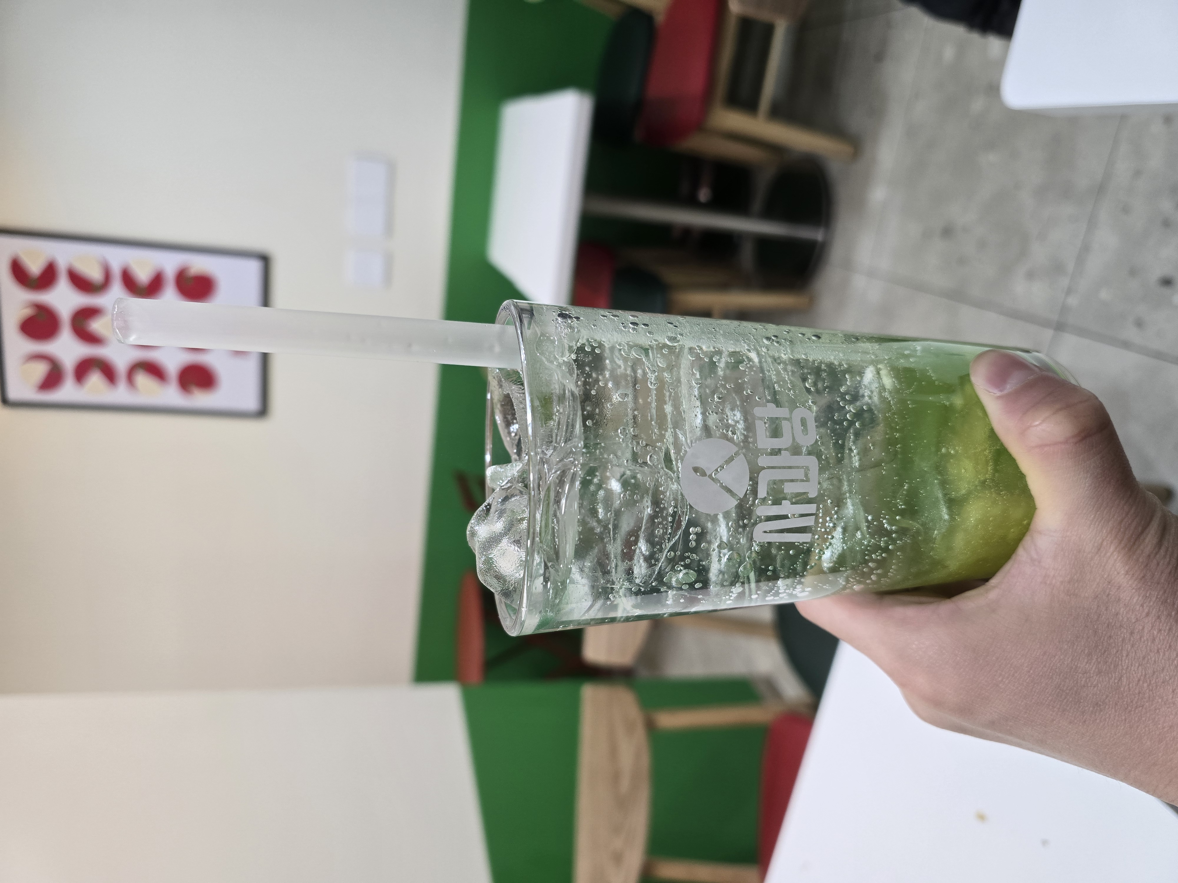 내부는 군더더기 없이 정돈되어 있었으며, 벽면에는 사과를 모티프로 한 아트워크가 걸려 있어 브랜드 아이덴티티가 공간 곳곳에 잘 녹아 있었습니다.