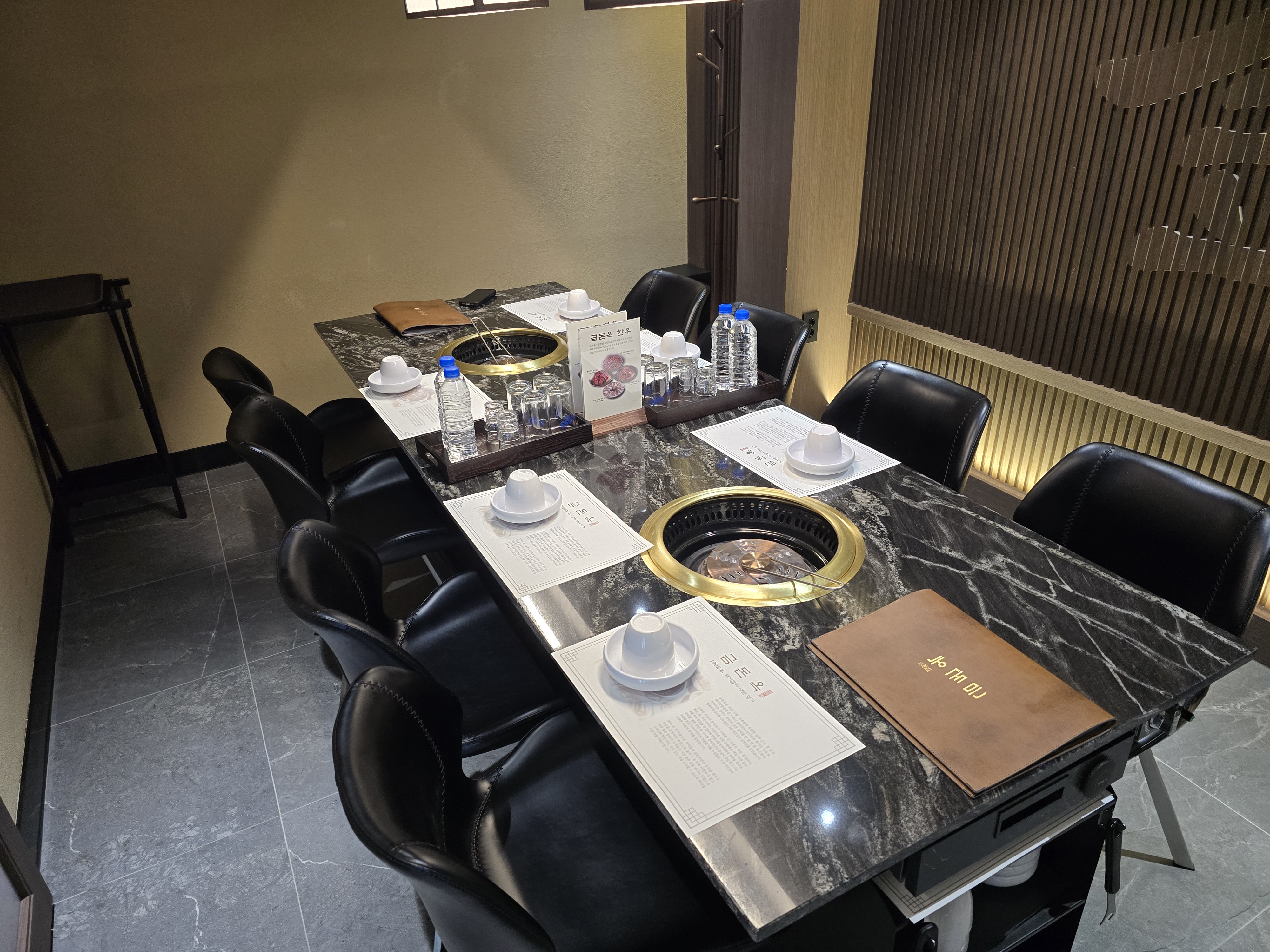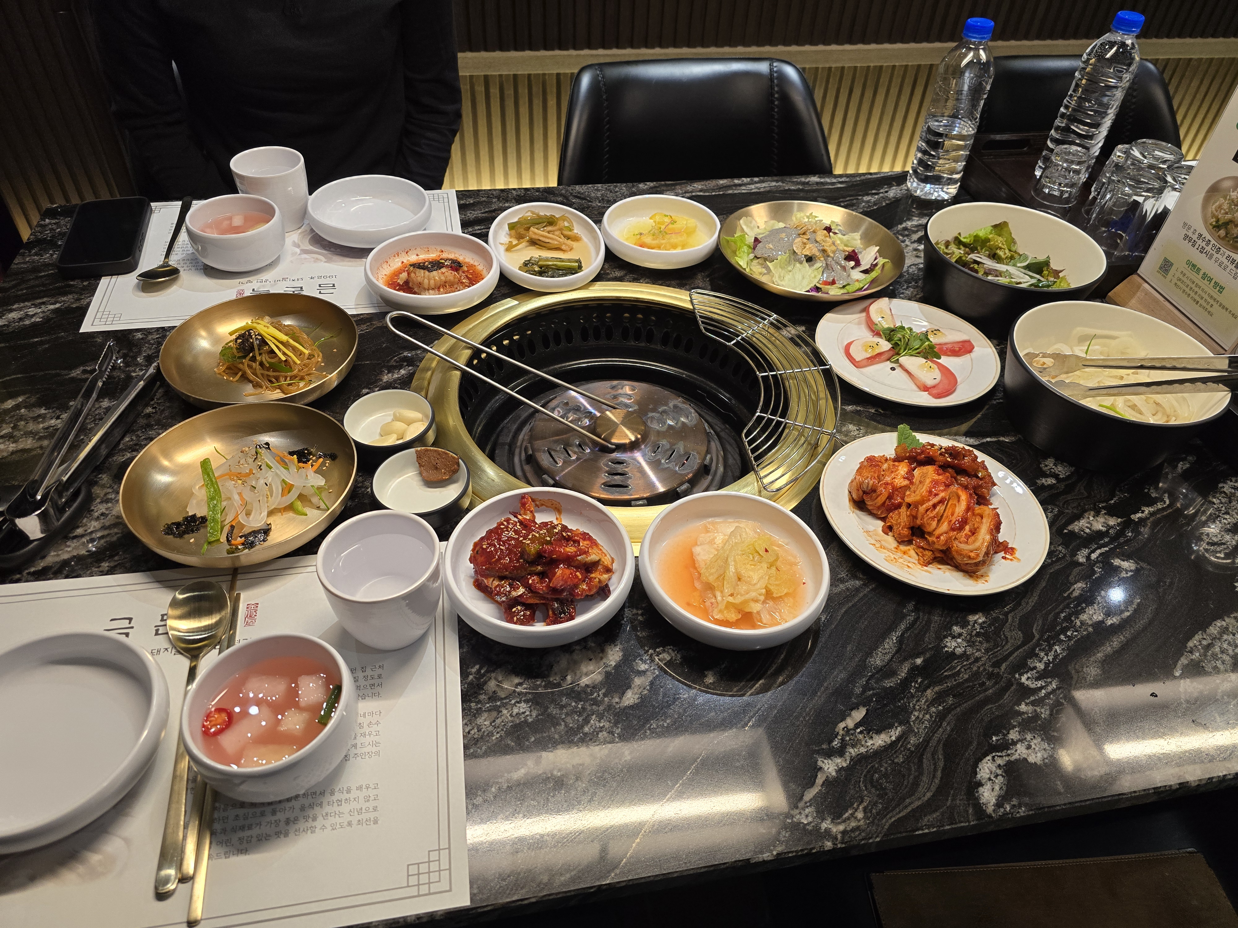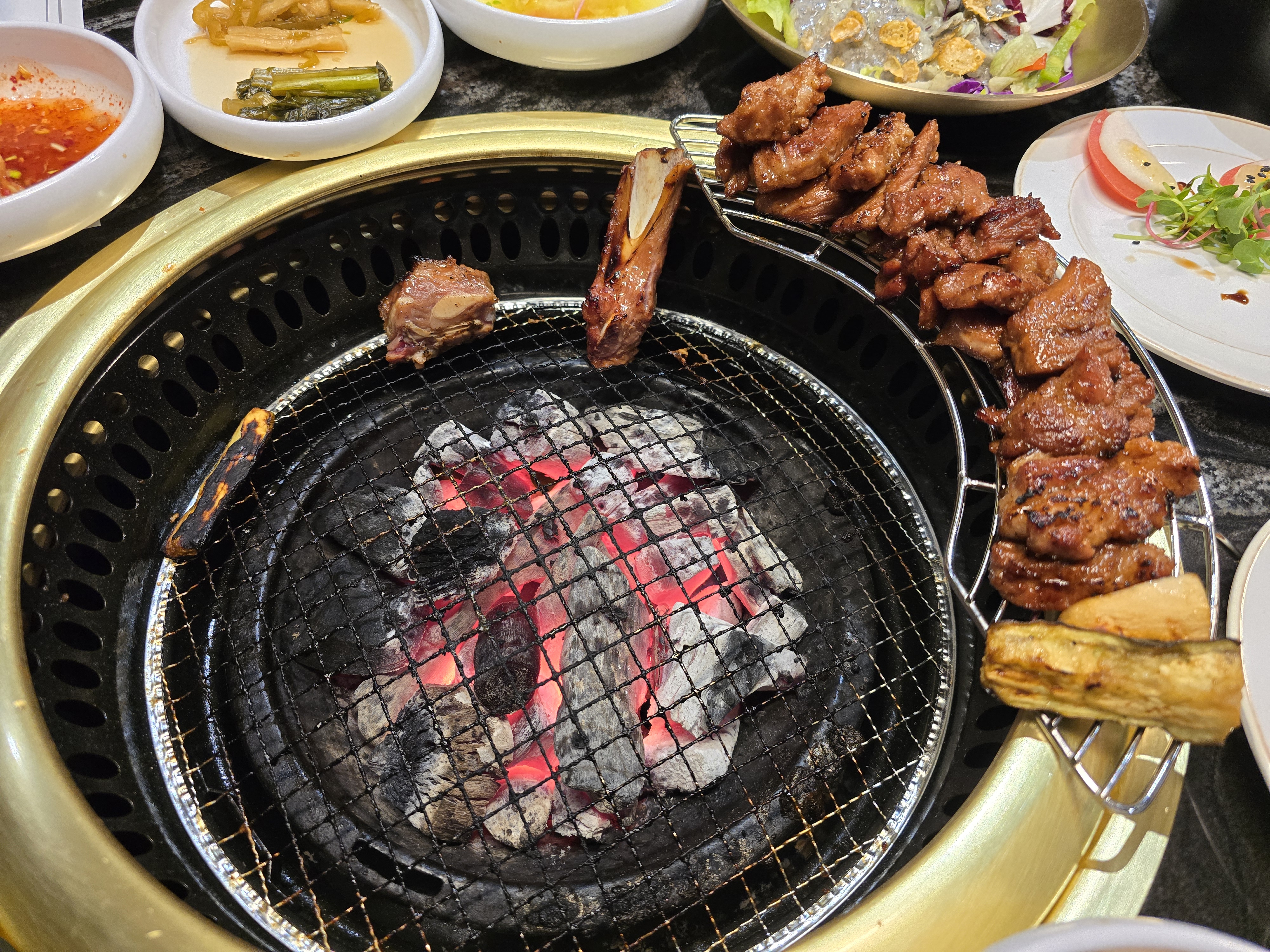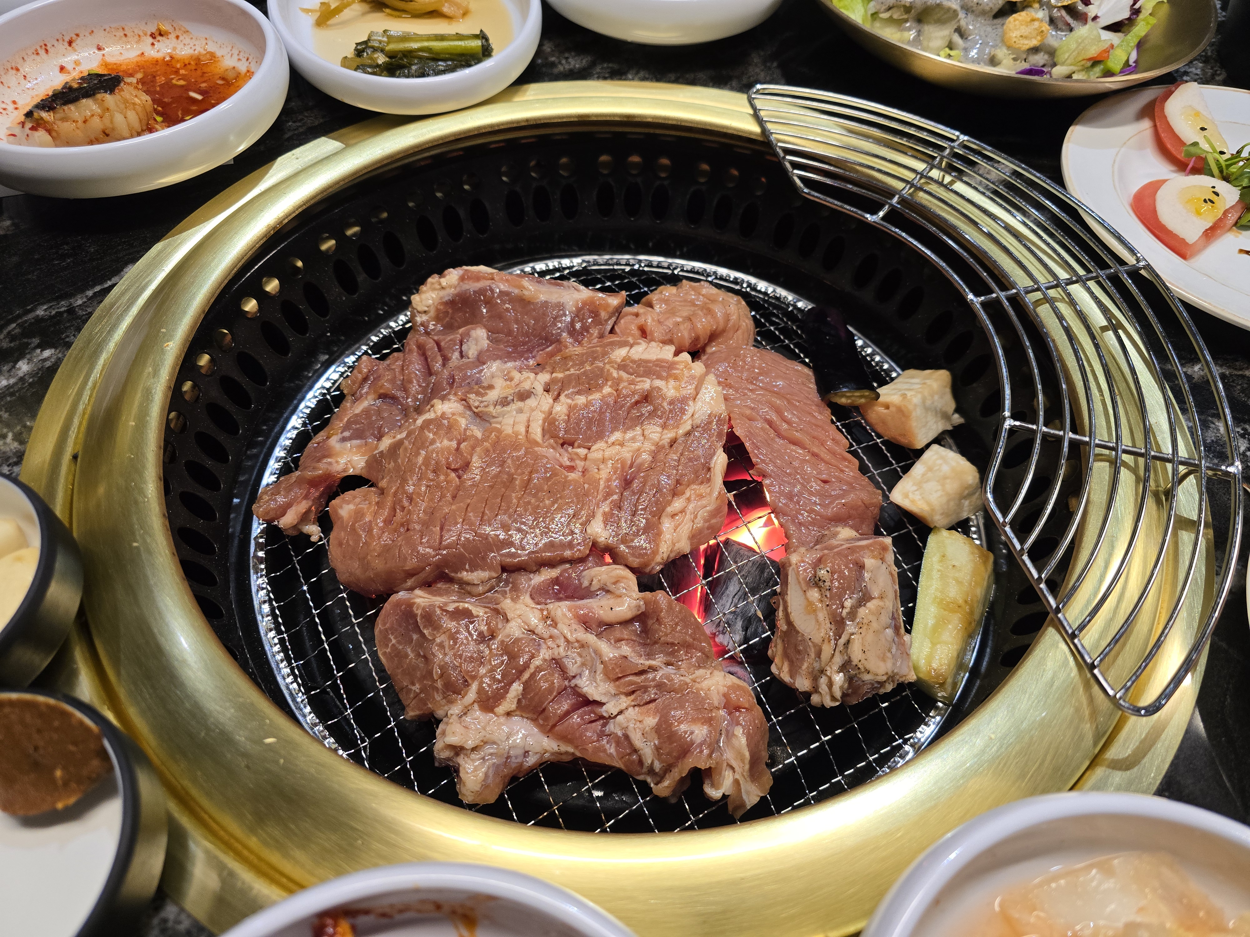 검은 대리석 테이블 위로 황동 숯불 그릴을 중심으로 다양한 반찬들이 하나씩 놓이기 시작하였습니다.