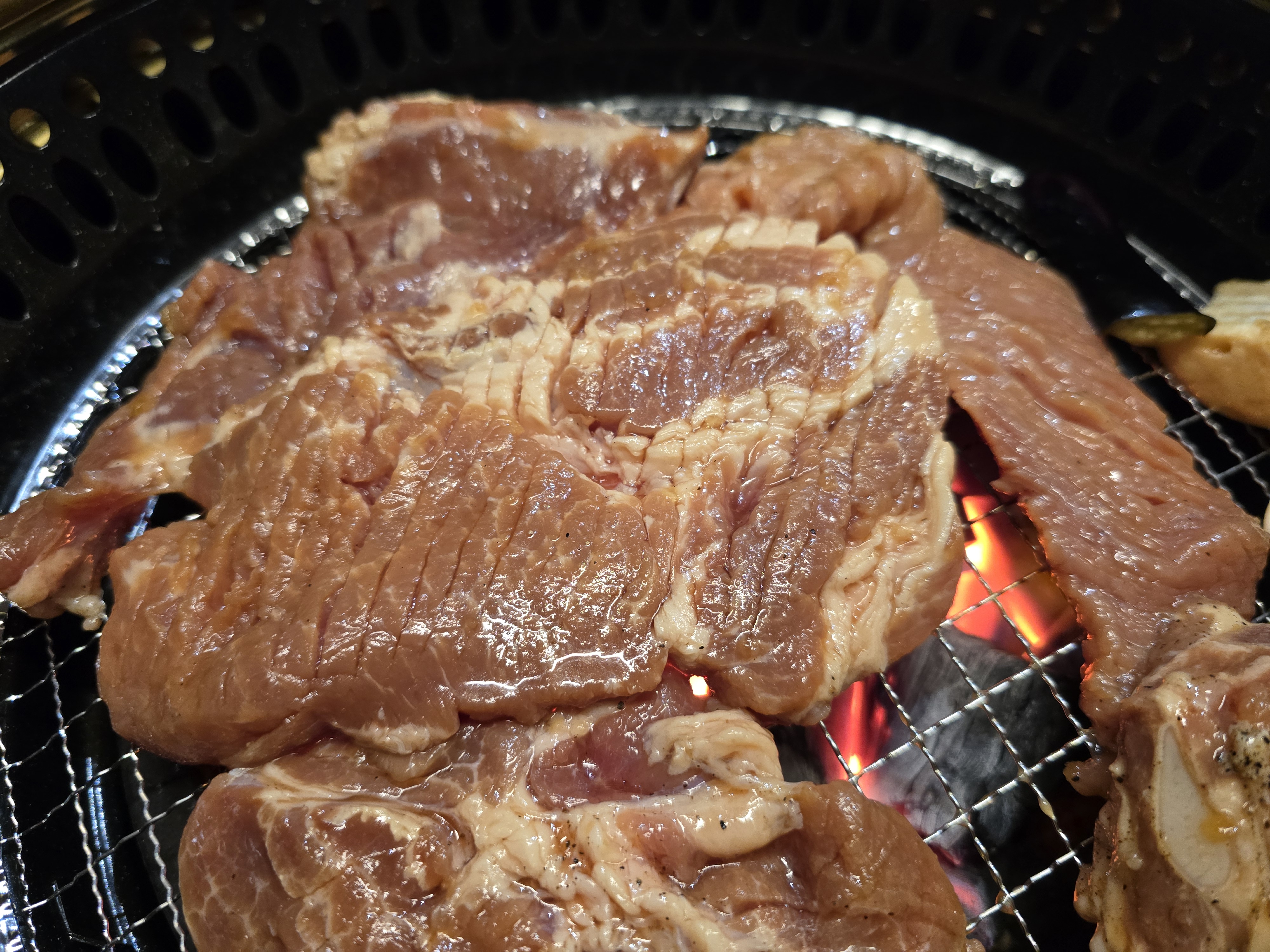 황동 링 그릴 사이로 빨갛게 타오르는 숯불 불꽃이 보이는 장면은 보는 것만으로도 식욕을 자극하기에 충분하였습니다.