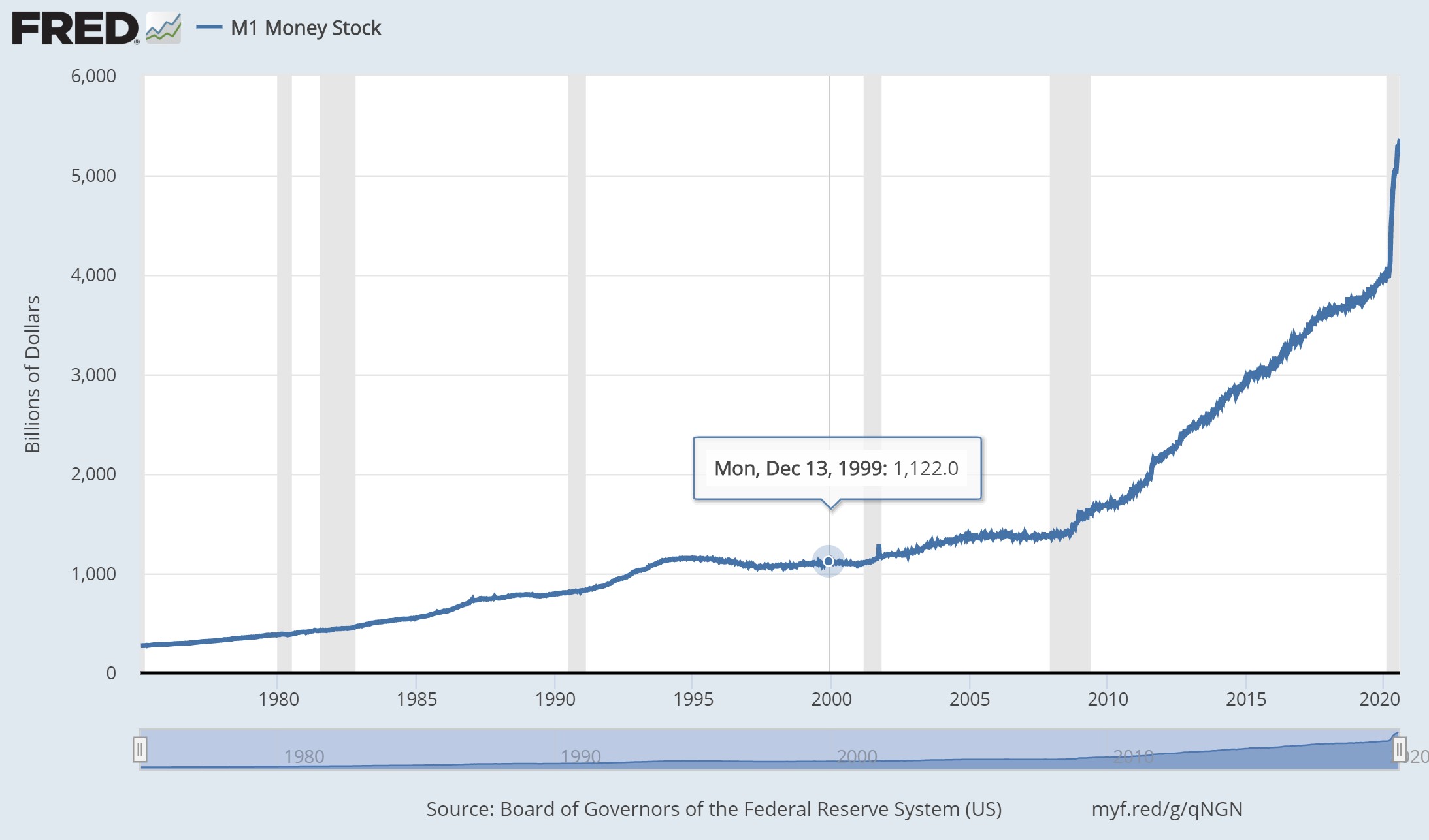 지금 이 순간 주요국의 모든 준비통화가 화폐타락현상을 겪고 있습니다. 근대 이후 여러번의 전쟁과 경제위기때 큰 화폐가격 하락이 있기는 했습니다만 지금같은 일은 없었습니다. 아래는 1975년부터 최근까지 M1통화량의 증가를 보여주는 차트입니다.