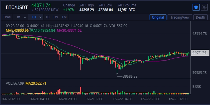 BTC가 44K까지 반등은 했지만 항다이슈의 여진이 남아있습니다.