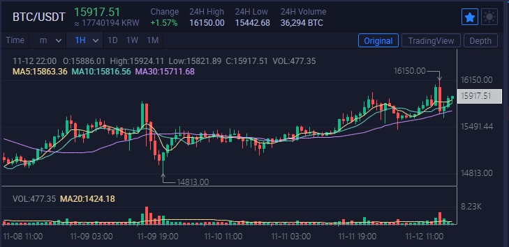 오늘 BTC는 16K를 넘었다가 숨고르기를 하고 있습니다.