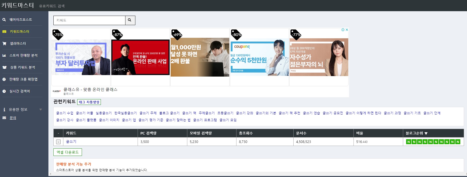 "글쓰기"라는 단어로 키워드마스터에서 검색해 보자