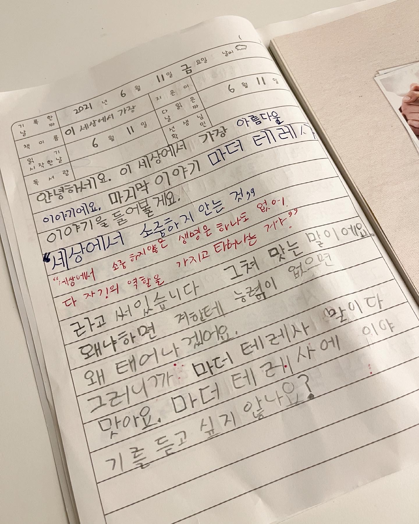 초등 딸램의 독서록loveecho (77)mod24만 건강 유튜버 러브에코in Korea • 한국 • KR • KO • 5 years ago ”세상에서 소중하지 않은 생명은 하나도 없어. 다 자기의 역할을 가지고 태어나는 거야.” 책 읽고 독서록 쓰라고 했더니, 어쩜 저렇게 핵심을 콕 집어서 잘 적었을까 감동 받았는데... 알고봤더니 책에 저렇게 적혀있... 책은 다 읽긴 했는지 심히 궁금 그나저나 저 문구가 네 가슴에 팍! 새겨졌으면 한다^^ 성의 없는듯하면서도, 저 말에 네 반응이 넘 인상깊네ㅋ #krsuccess