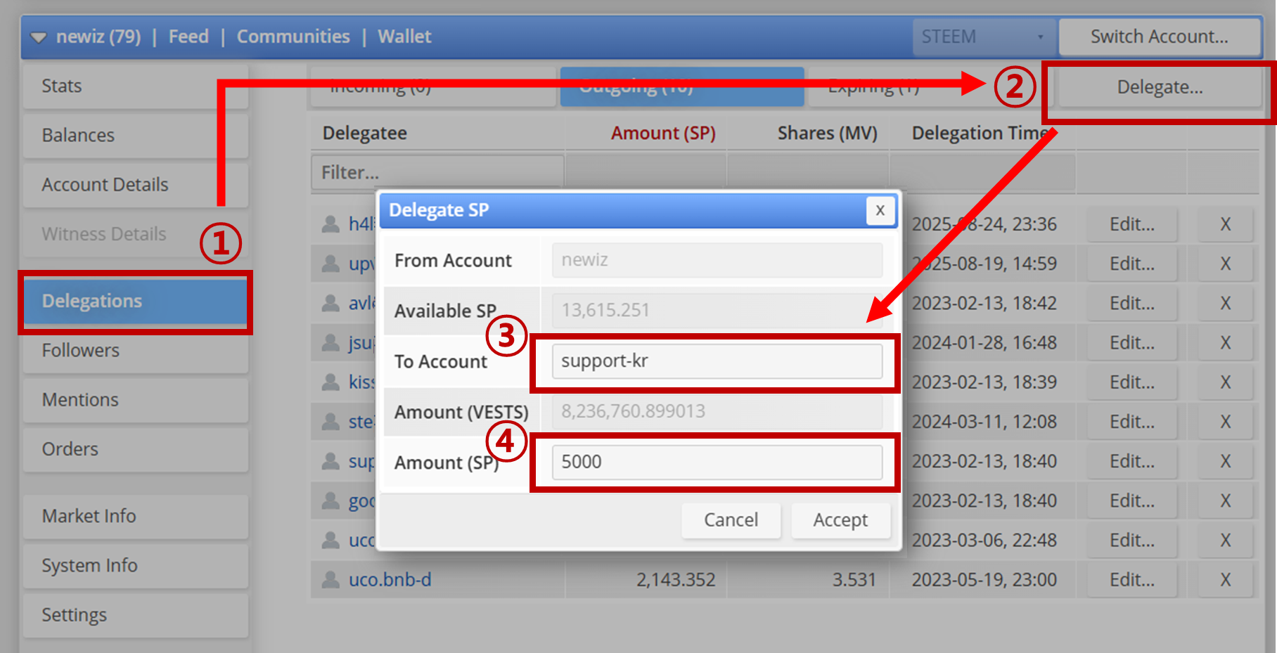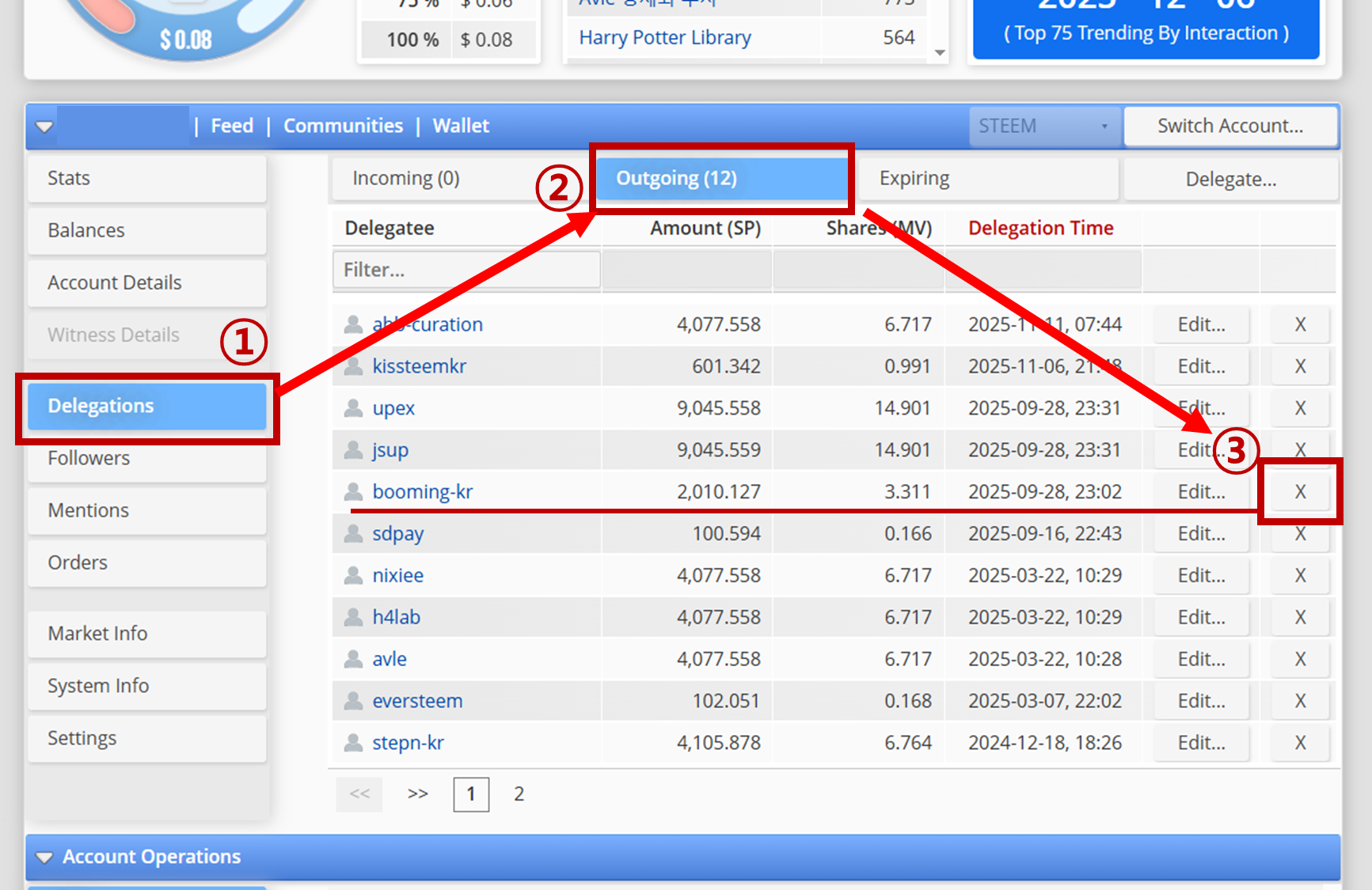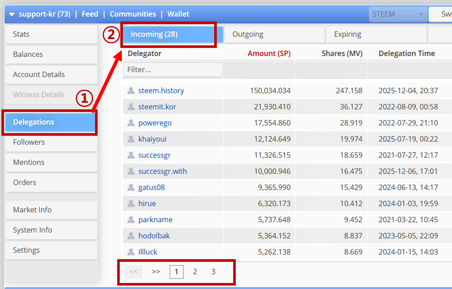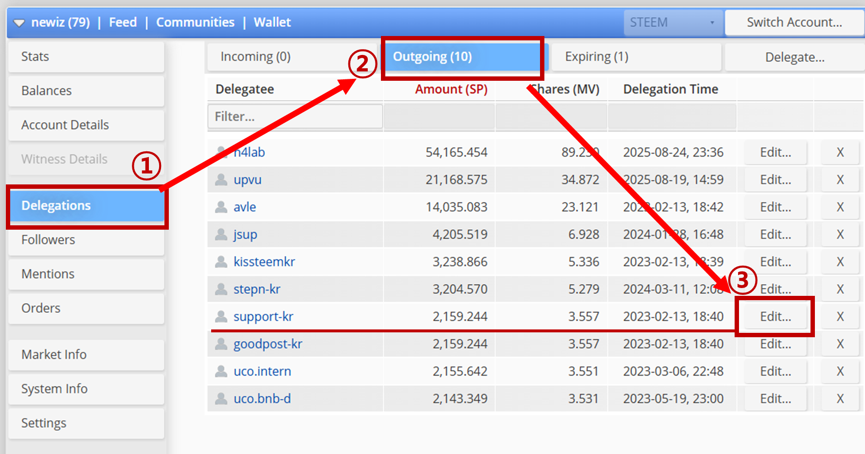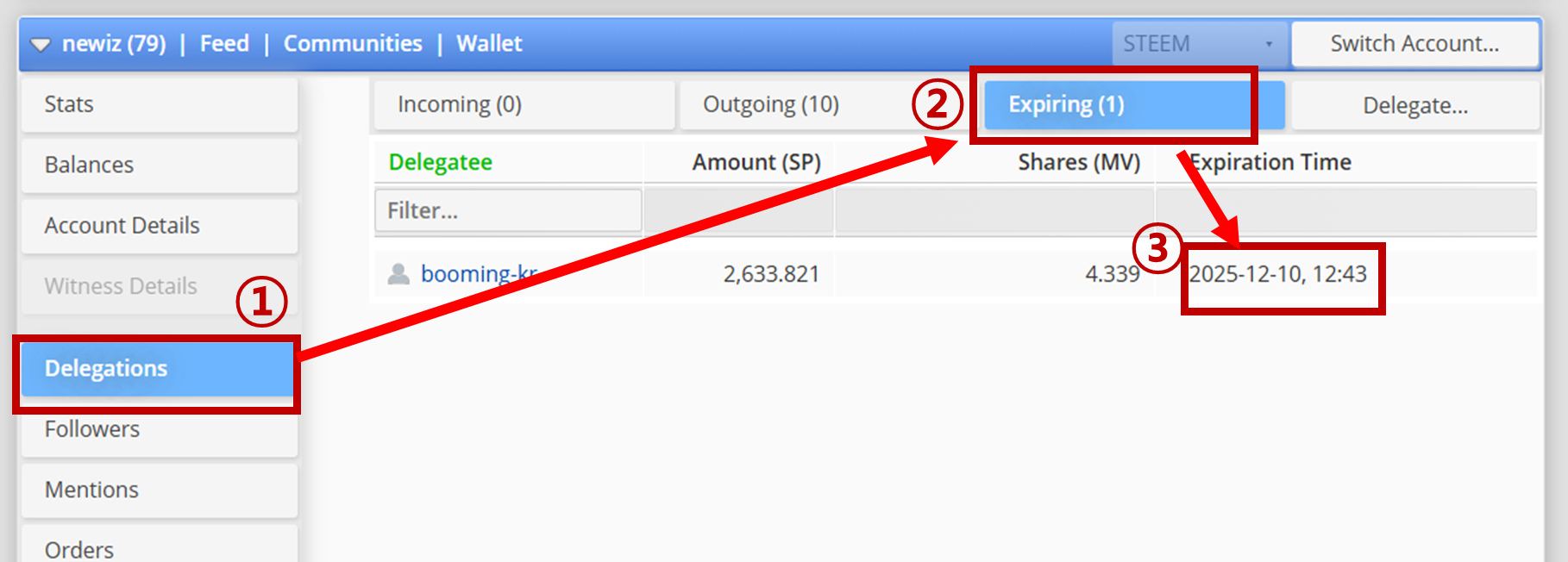 스팀월드에서 [Delegations] → [Expiring]을 누르시면