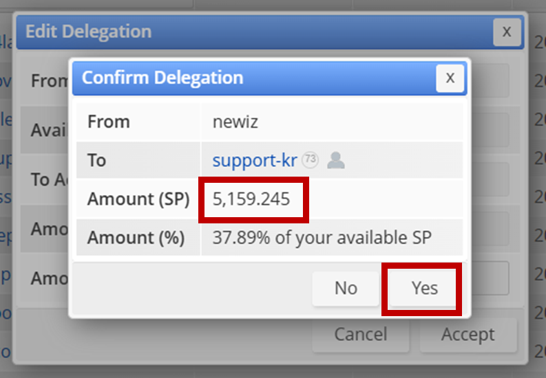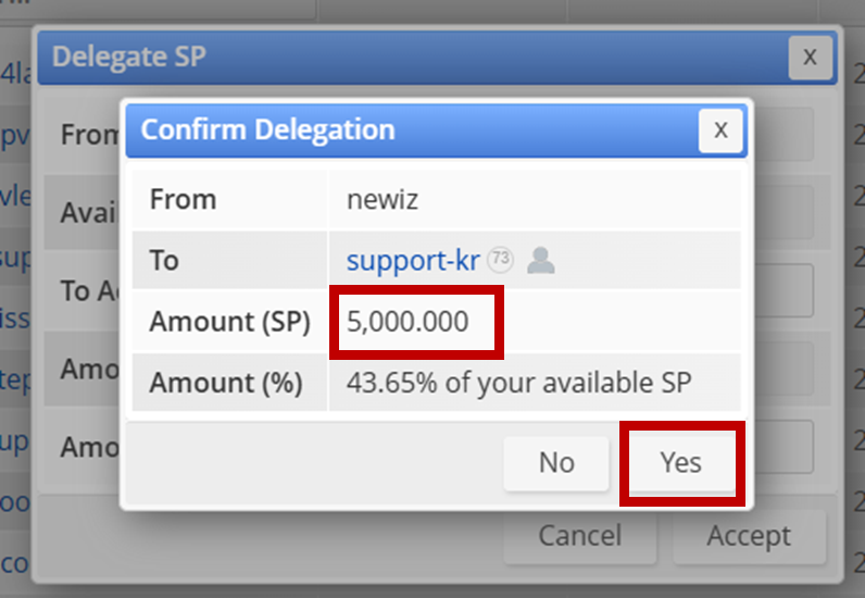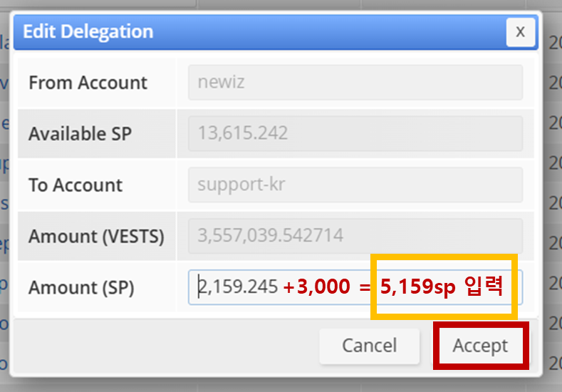 팝업창에서 임대해줄 계정명(support-kr)과 임대량 기입