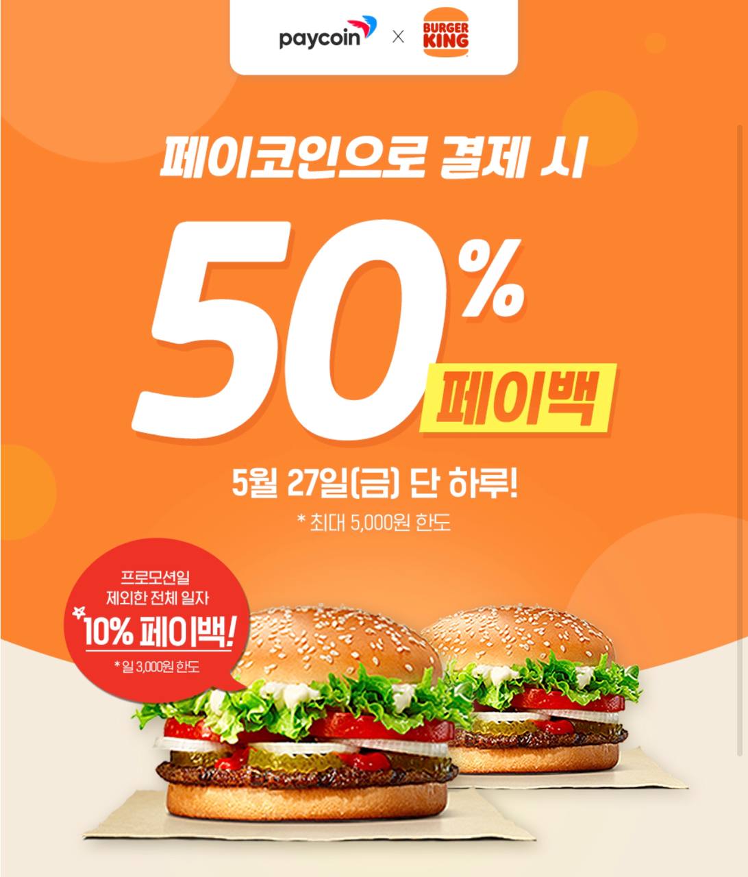 페이코인으로 결제하면 버거킹 50% 페이백!! (5.27 금요일 단 하루)