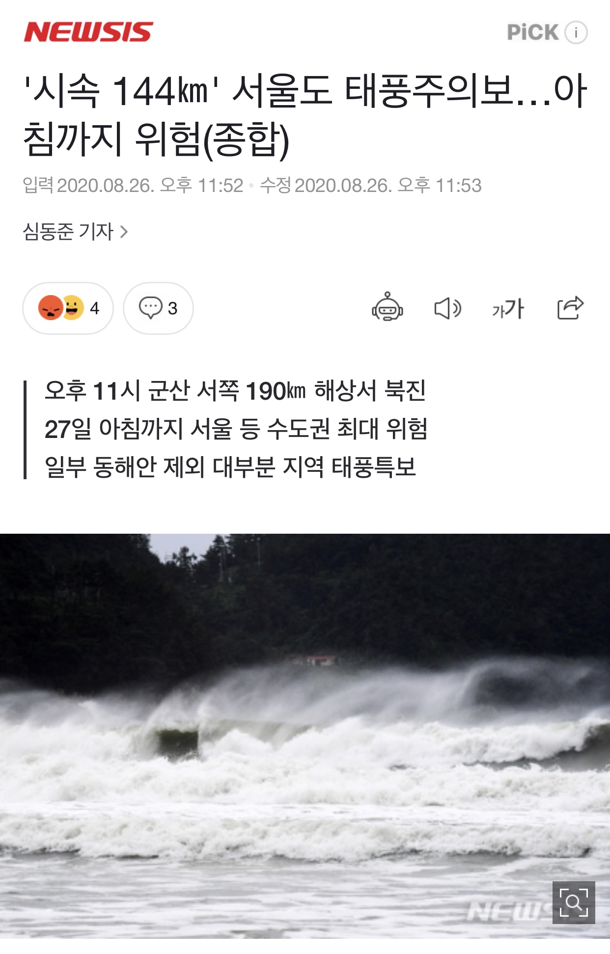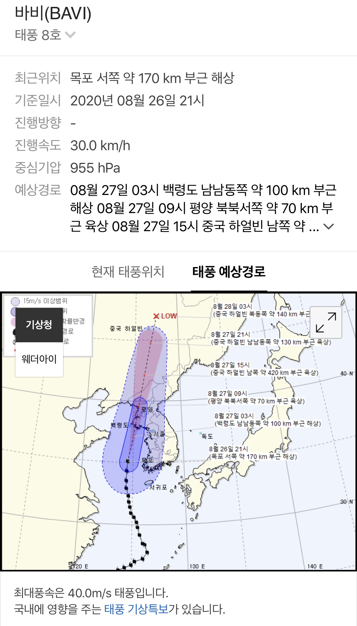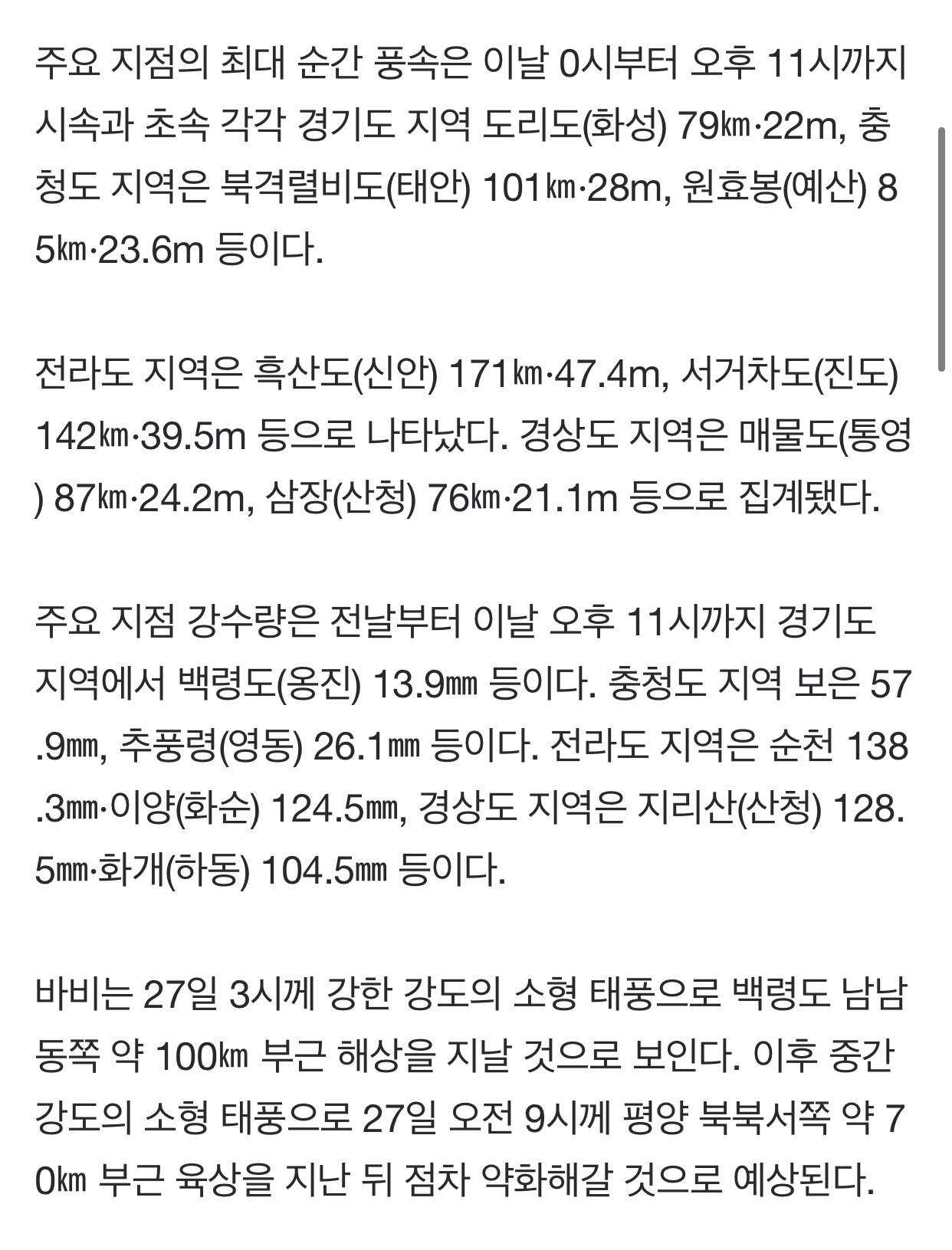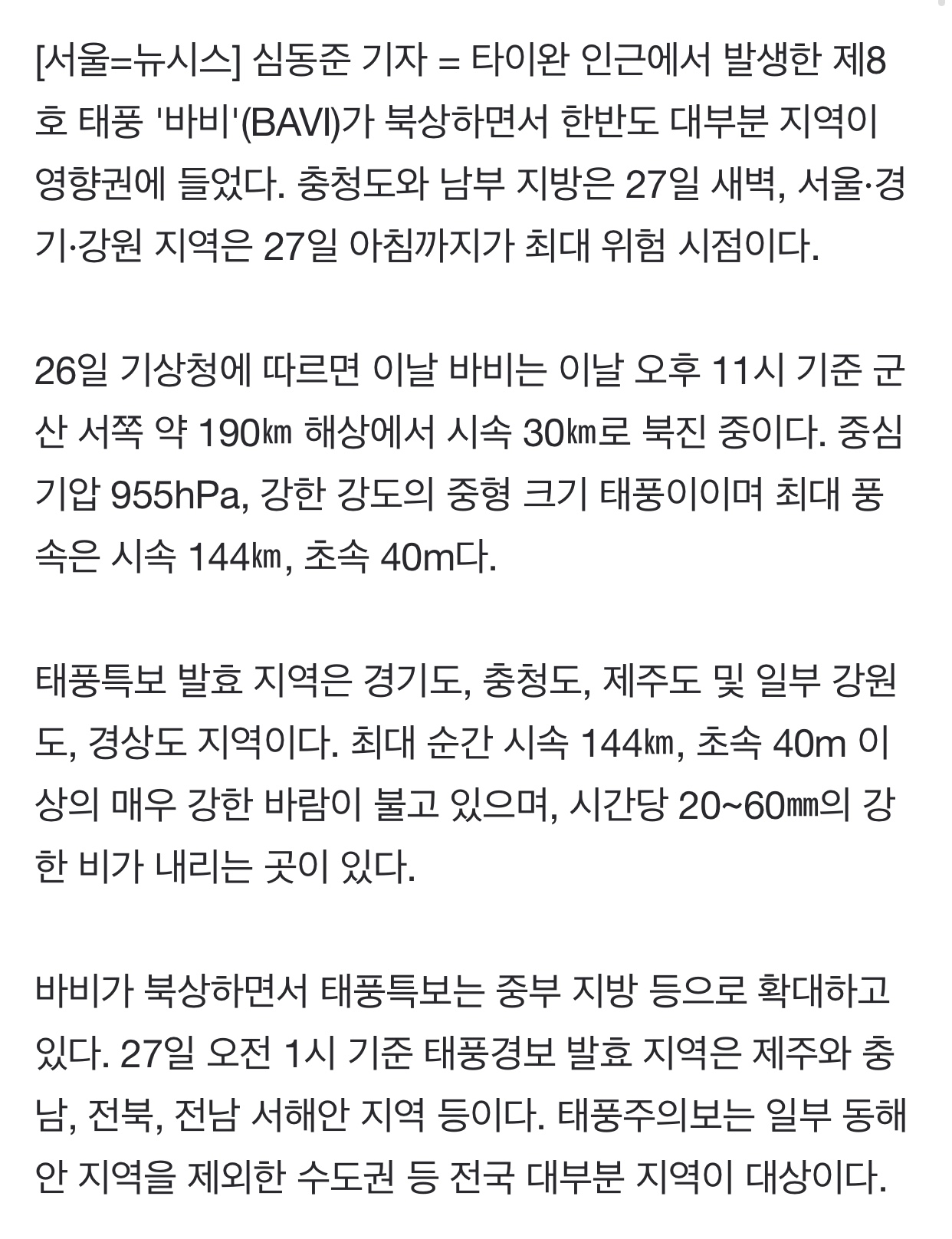 [기사 스크랩] 태풍 바비. 서울은 27일 목요일 아침이 고비래요.