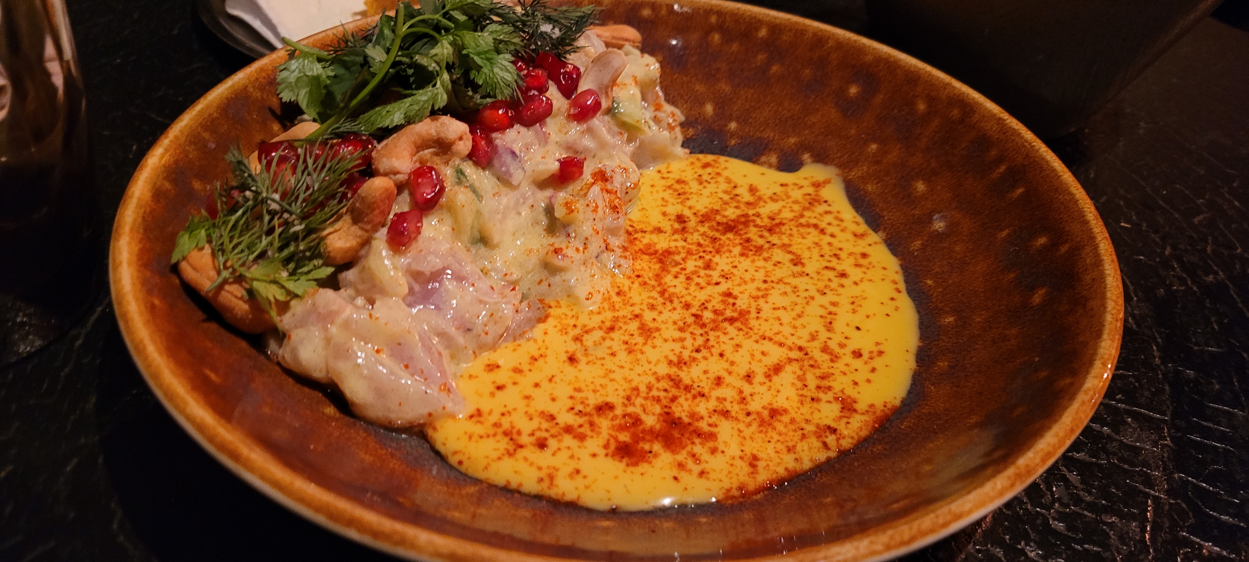 도미 세비체 요리 입니다. 세비체(Vebiche)는 생선이나 해산물을 얇게 썰어 레몬이나 라인즙 향신채에 재어두었다가 먹는 페루의 대표적인 요리의 하나입니다.