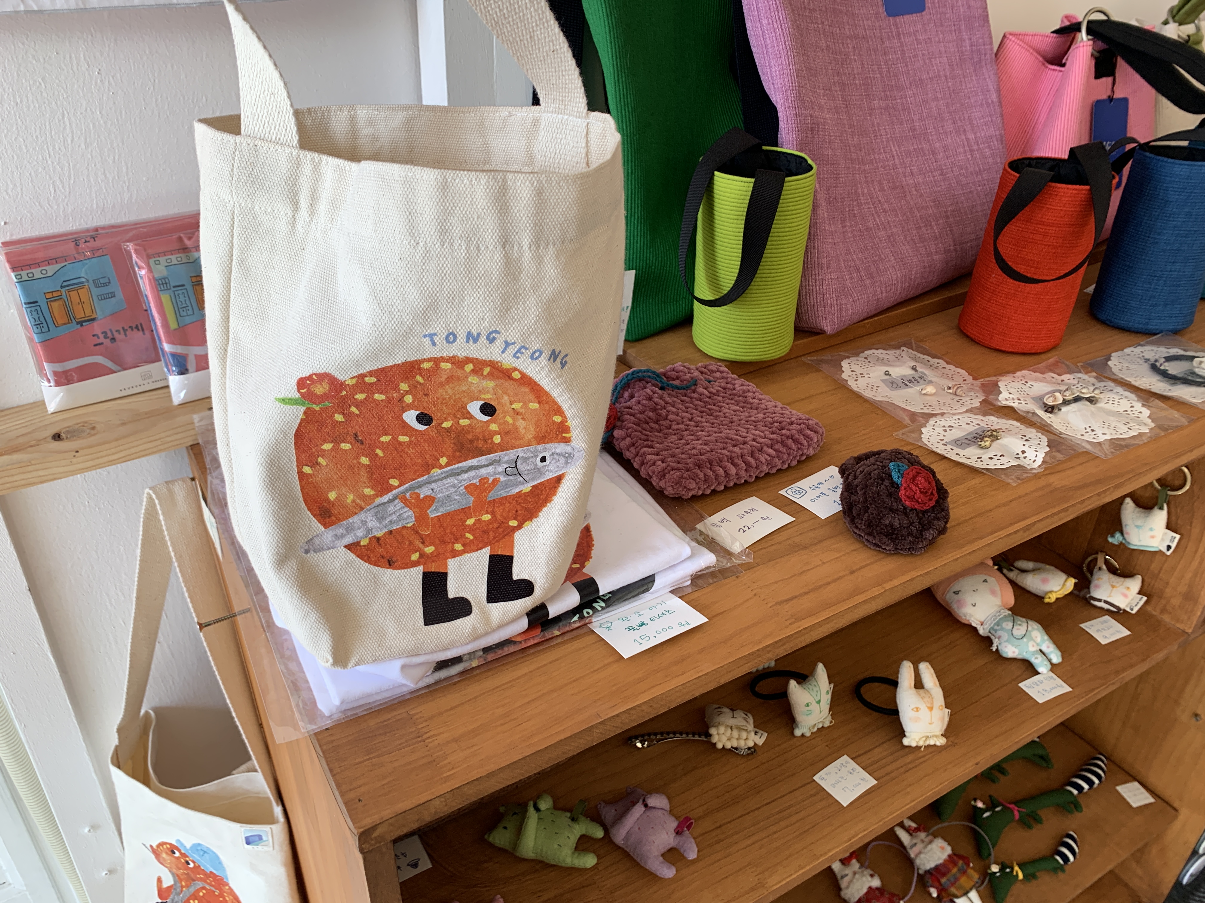 꿀빵 캐릭터로 만든 배지나 에코백, 자석등이 있는데