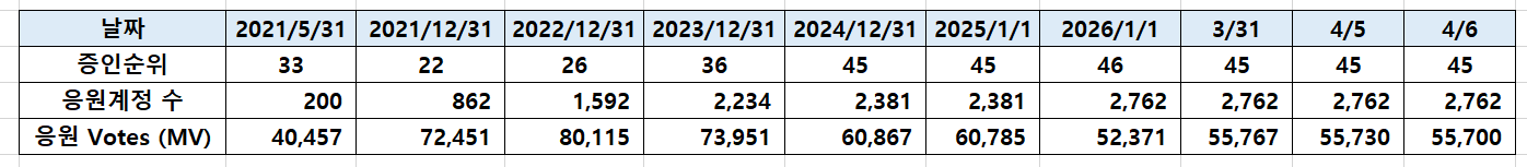 [260406] @successgr.with witness 활동실적successgr.with (75)in Korea • 한국 • KR • KO • 22 days ago [기본보팅 ] 일 1회 krsuccess 태그를 사용하신 분들께 보팅합니다. KR에 성공을 응원합니다 . 태그 사용을 모르시는 분들께 홍보 부탁 드립니다. [공지] 어뷰징계정 차단중 (별도설명없이 본인판단 차단함.) 어뷰징계정 : 단순 보팅용 포스팅 (스파업X , 활동 X , 1인다역 포스팅,타인포스팅 복붙,지속 복붙) 집중차단중입니다. (1인다역 , 지속복붙 포스팅) 포스팅에 커피한잔 응원을 목표로 지속 스파업중입니다. 증인투표로 많은 응원 부탁드립니다. [ 활동요약] [증인순위] #kr #witness