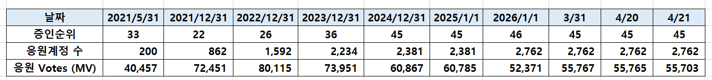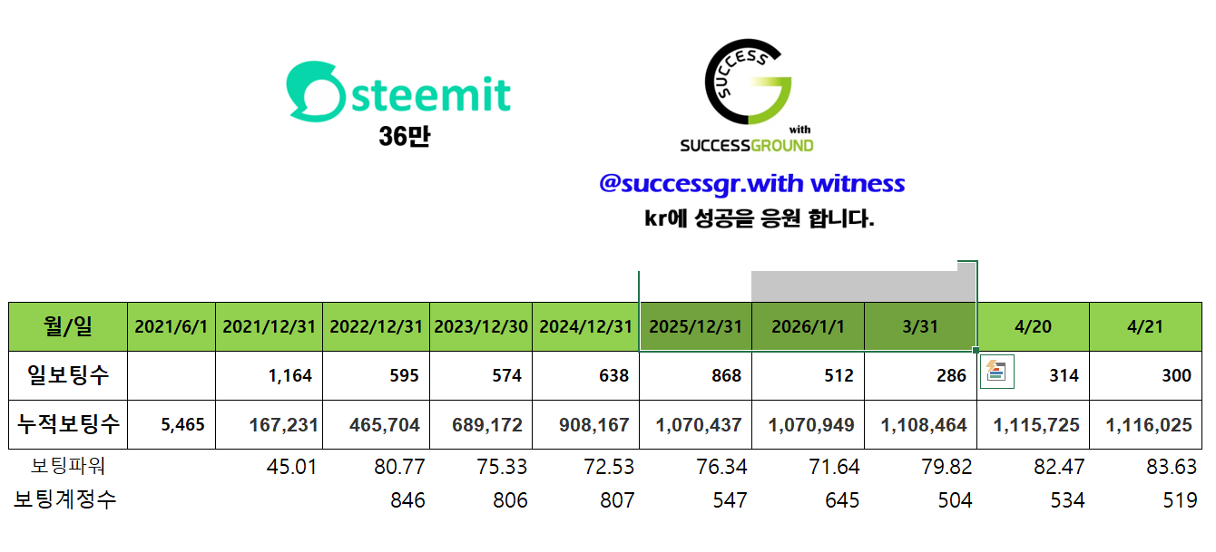 [260421] @successgr.with witness 활동실적successgr.with (75)in Korea • 한국 • KR • KO • 7 days ago [기본보팅 ] 일 1회 krsuccess 태그를 사용하신 분들께 보팅합니다. KR에 성공을 응원합니다 . 태그 사용을 모르시는 분들께 홍보 부탁 드립니다. [공지] 어뷰징계정 차단중 (별도설명없이 본인판단 차단함.) 어뷰징계정 : 단순 보팅용 포스팅 (스파업X , 활동 X , 1인다역 포스팅,타인포스팅 복붙,지속 복붙) 집중차단중입니다. (1인다역 , 지속복붙 포스팅) 포스팅에 커피한잔 응원을 목표로 지속 스파업중입니다. 증인투표로 많은 응원 부탁드립니다. [ 활동요약] [증인순위] 증인투표로 응원 부탁드립니다. #kr #witness