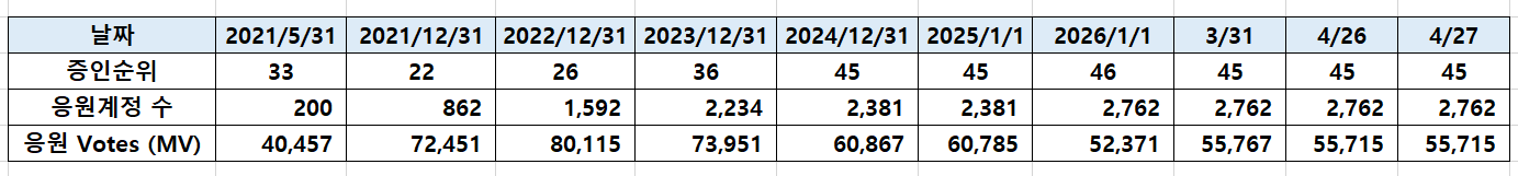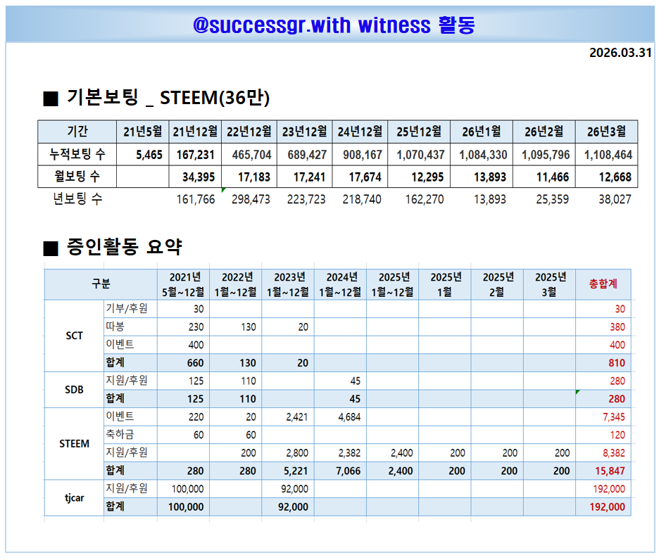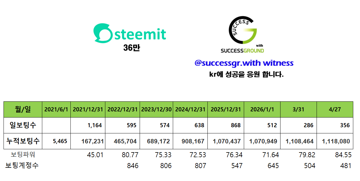 [260427] @successgr.with witness 활동실적successgr.with (75)in Korea • 한국 • KR • KO • 12 hours ago [기본보팅 ] 일 1회 krsuccess 태그를 사용하신 분들께 보팅합니다. KR에 성공을 응원합니다 . 태그 사용을 모르시는 분들께 홍보 부탁 드립니다. [공지] 어뷰징계정 차단중 (별도설명없이 본인판단 차단함.) 어뷰징계정 : 단순 보팅용 포스팅 (스파업X , 활동 X , 1인다역 포스팅,타인포스팅 복붙,지속 복붙) 집중차단중입니다. (1인다역 , 지속복붙 포스팅) 포스팅에 커피한잔 응원을 목표로 지속 스파업중입니다. 증인투표로 많은 응원 부탁드립니다. [ 활동요약] [증인순위] 증인투표로 응원 부탁드립니다. #kr #witness