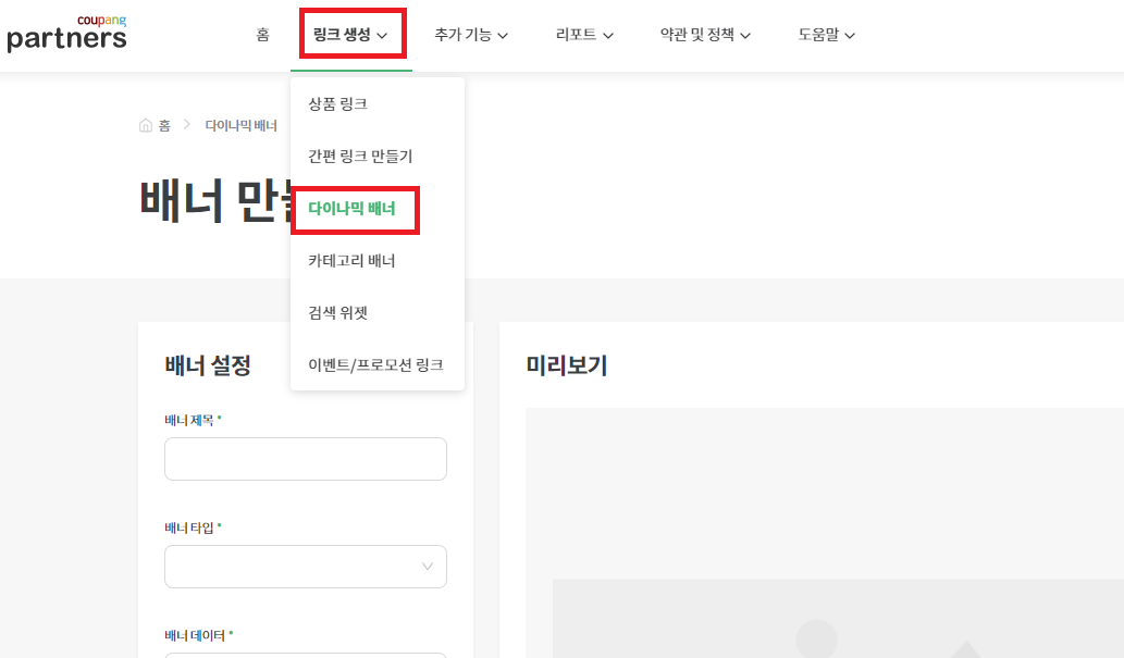 - 아래에 나오는 메뉴 중 '다이나믹 배너'를 선택합니다.