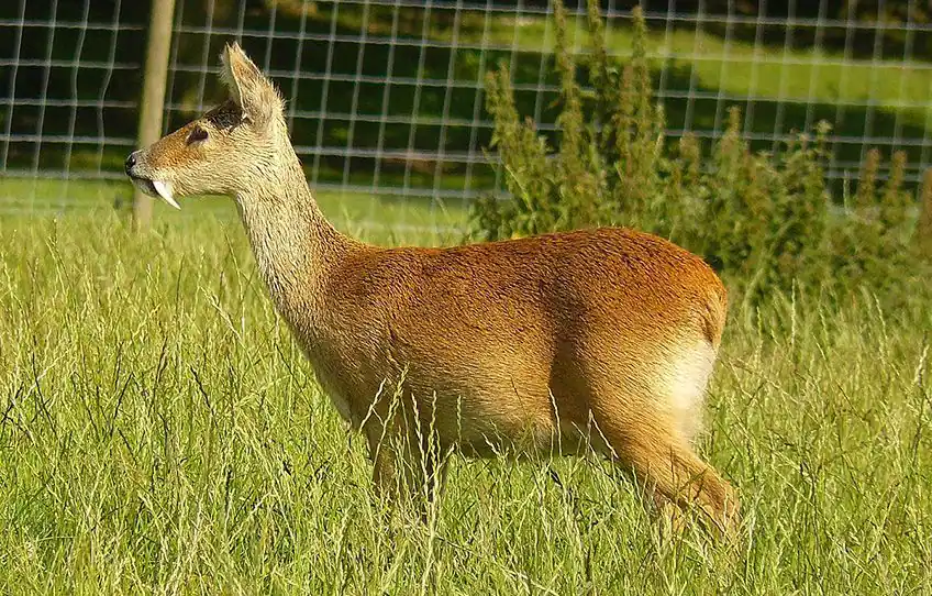 이 사슴뿔 없는 사슴은 귀엽고도 이상합니다! 입에서 두 개의 긴 엄니가 자라서 "뱀파이어 사슴"이라고도 불리는 수컷 사슴은 뿔 대신 이 이빨을 사용하여 서로 싸웁니다. 하지만 대부분은 보여주기 위한 것이며, 나머지 시간에는 사슴이 일반 이빨을 사용하여 강과 늪 근처에서 발견되는 식물을 갉아먹습니다.야생 멧돼지