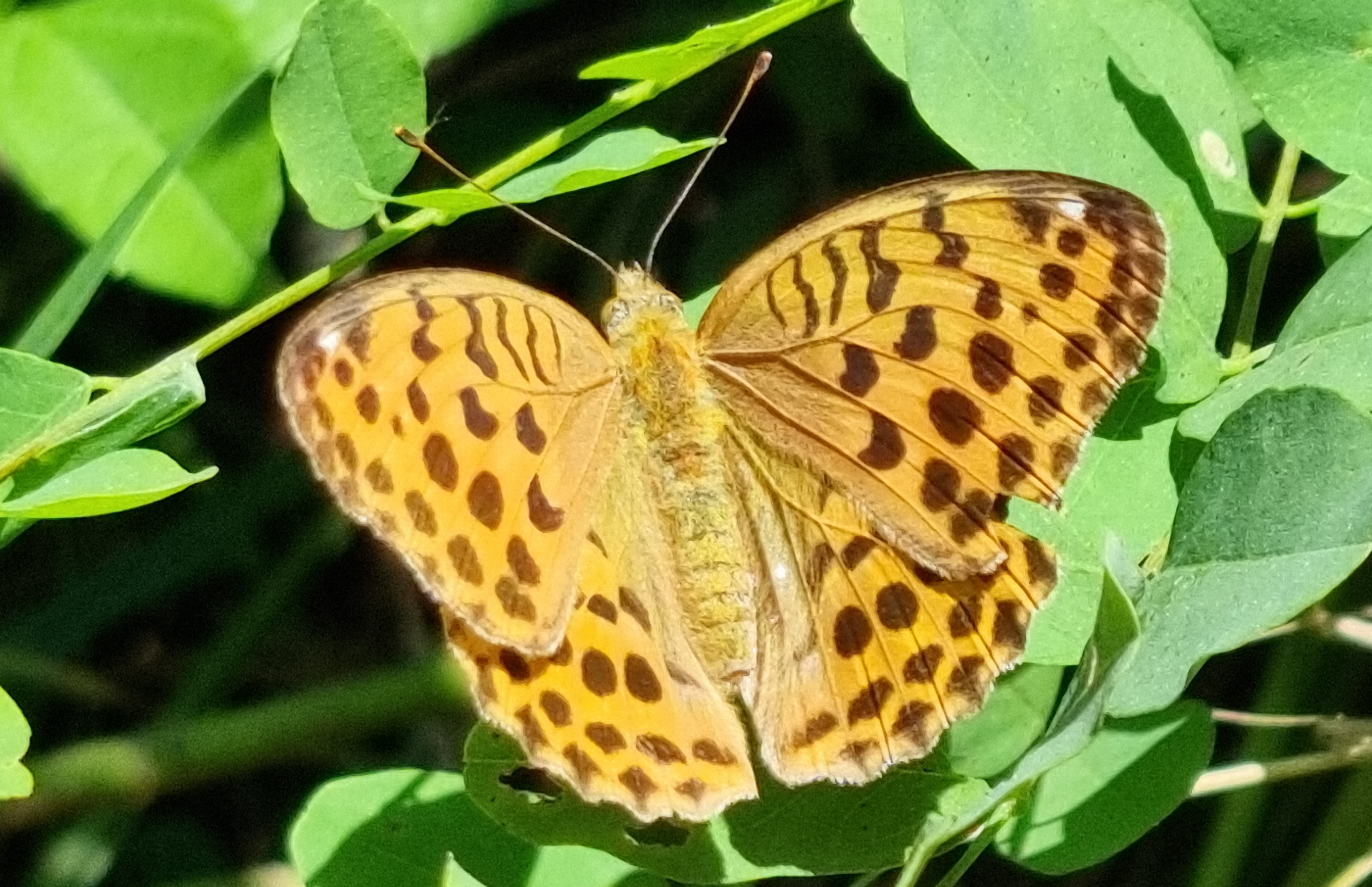 나비가 나방같이 생겼네요. 표범무늬를 가진....
