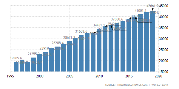 우리나라의 경제는 항상 어려움에 있었지만, 매년 GDP성장은 계속되어 구매력 기준으로 1인당 4만불을 훌쩍 뛰어넘었다. 이를 기준으로 봤을 때는 일본보다도 잘 산다고 얘기할 수 있을 정도이다.(일본의 2019년 1인당 GDP(구매력 기준)는 41429 달러였다.)