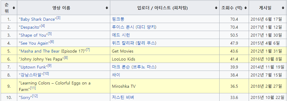 아기 상어가... 무려 70억회 조회수라서 1억회는