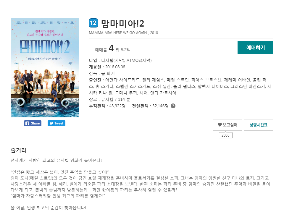 2018.08.08 맘마미아 2편이 극장에서 개봉한다고 합니다