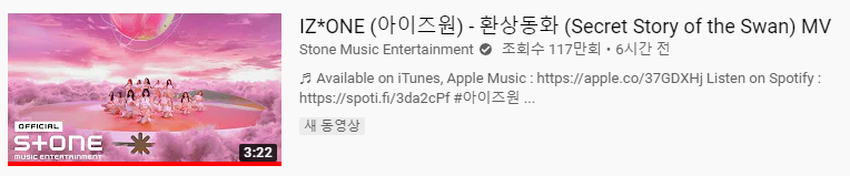 아이즈원이 돌아왔습니다ai1love (68)in #kr • 6 years ago IZ*ONE (아이즈원) - 환상동화 (Secret Story of the Swan) MV 아이즈원 뮤비가 공개된지.... 6시간만에 117만회 재생이 이루어 졌네요 와우.... 어제 공개된 영상은... 23시간만에 324만회 재생이 되었구요 대단한 속도네요 기다리던 아이즈원 ~~ 화이팅~ #zzan #izone #gogogo #music