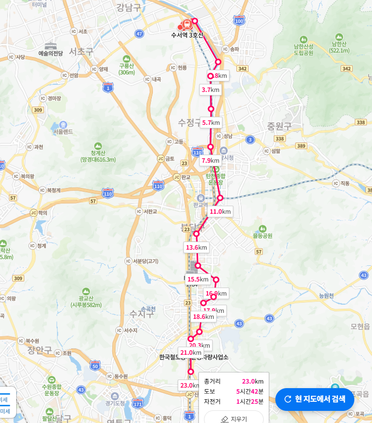 구성역까지 네이버 지도로 찍어보면 약23km 정도