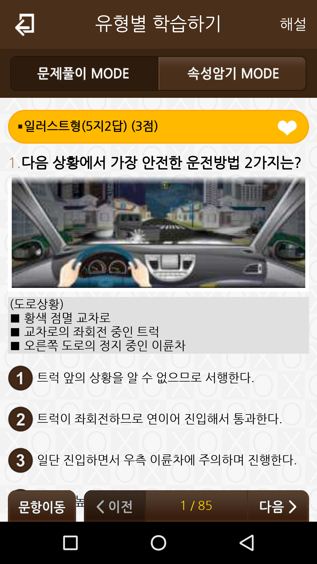 학과시험은 안전운전에 필요한 보행자 보호, 보복 운전 예방 등을 충분히 숙지할 수 있게 추가된 문항이 있다고 들었다. 컴퓨터로 차례차례 시험을 치르면 되는데 약 40문제 중 20문제는 주어진 교통 상황에서 옳거나 그릇된 행동을 찾는 문제들이 많았다. 2종 보통이라 60점을 넘겨 하루 만에 통과할 수 있었다. (참고로 시험을 치르기 전 ‘운전면허PLUS’ 라는 어플을 이용하여 여러 번 문제를 풀어보았다)
