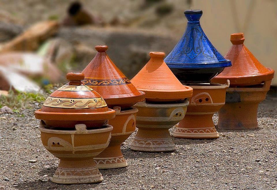물이 부족한 지역에 사는 모로코의 오래된 베르베르 민족이 적은 양의 물로도 조리를 할 수 있도록 개발한 요리법 그리고 전통 그릇이다. 재료를 담아 예쁘게 쌓아 넣고 아래 쪽에서 가열을 하게 되면 재료에서 증발한 수분이 원뿔 중앙에 모여 다시 떨어지도록 설계가 되었다고 한다.