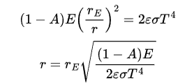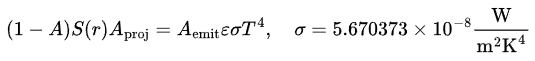 방사평형 (放射平衡) 상태에서의 태양 복사 에너지 흡수 일률은 다음과 같은 간단한 열복사 식으로 표현가능합니다.