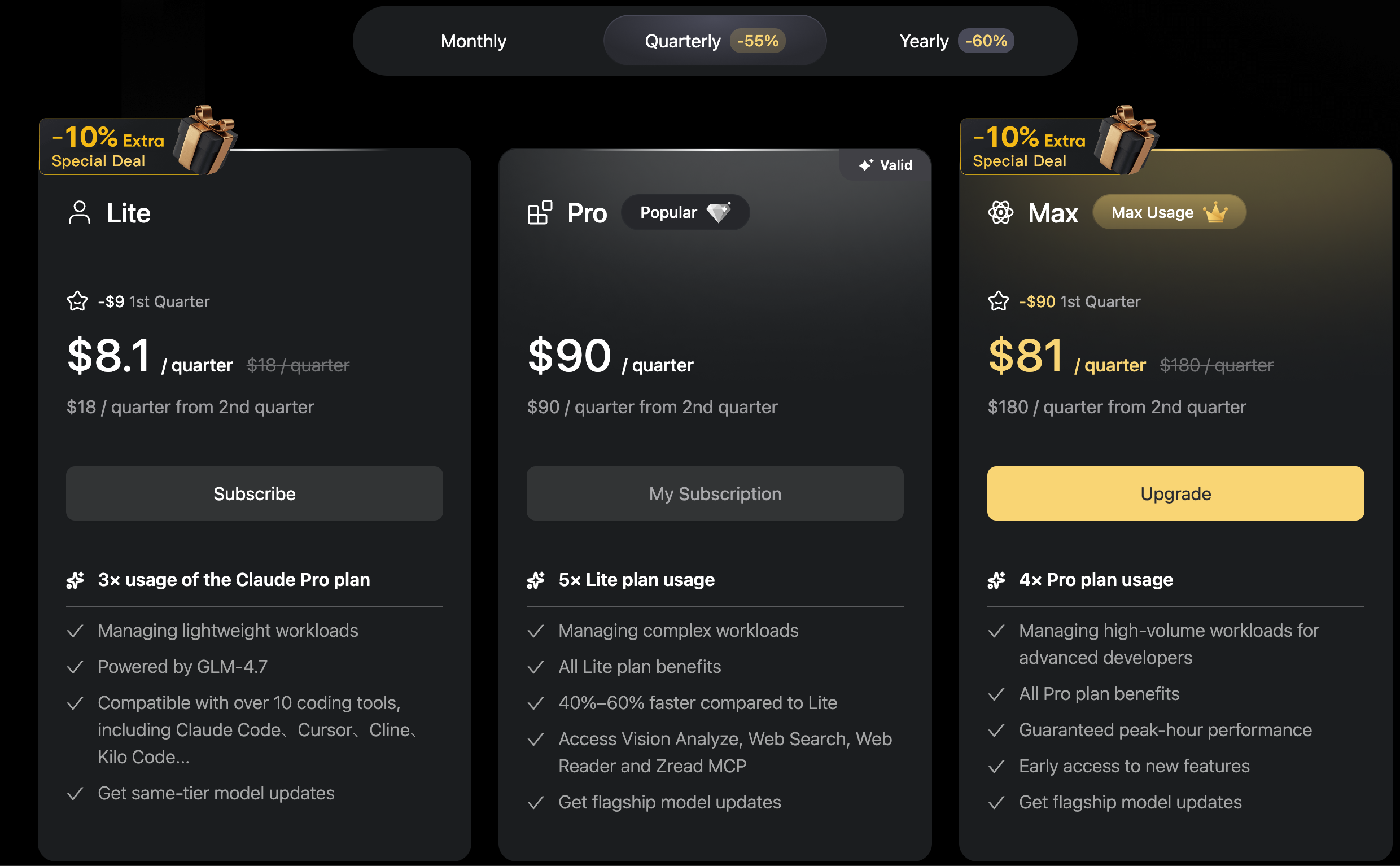 사실 저도 처음엔 Claude Code 구독을 해지하고 z.ai로 넘어가는 게 맞나 싶었는데, Lite Plan(Claude Code Pro 대비 3배 토큰)을 이용하면 월 $3(커피 한 잔 값)에 쓸 수 있어서 가성비가 말이 안 되게 좋더군요.