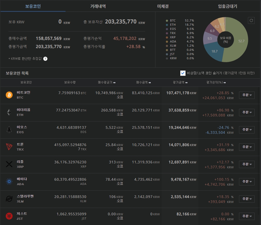 여튼, 길게보면 더 오를 것 같은 막연한 욕심과 탐욕(?)에 현금 탈탈 털어서 결국 KRW는 0으로 탕진해버렸다. 업비트는 오늘 2.11억까지 봤는데, 현재 2.04억이네? 뭐 하루에 몇 백만원 왔다갔다 하는것은 숱하게 봐서 아무렇지 않다.