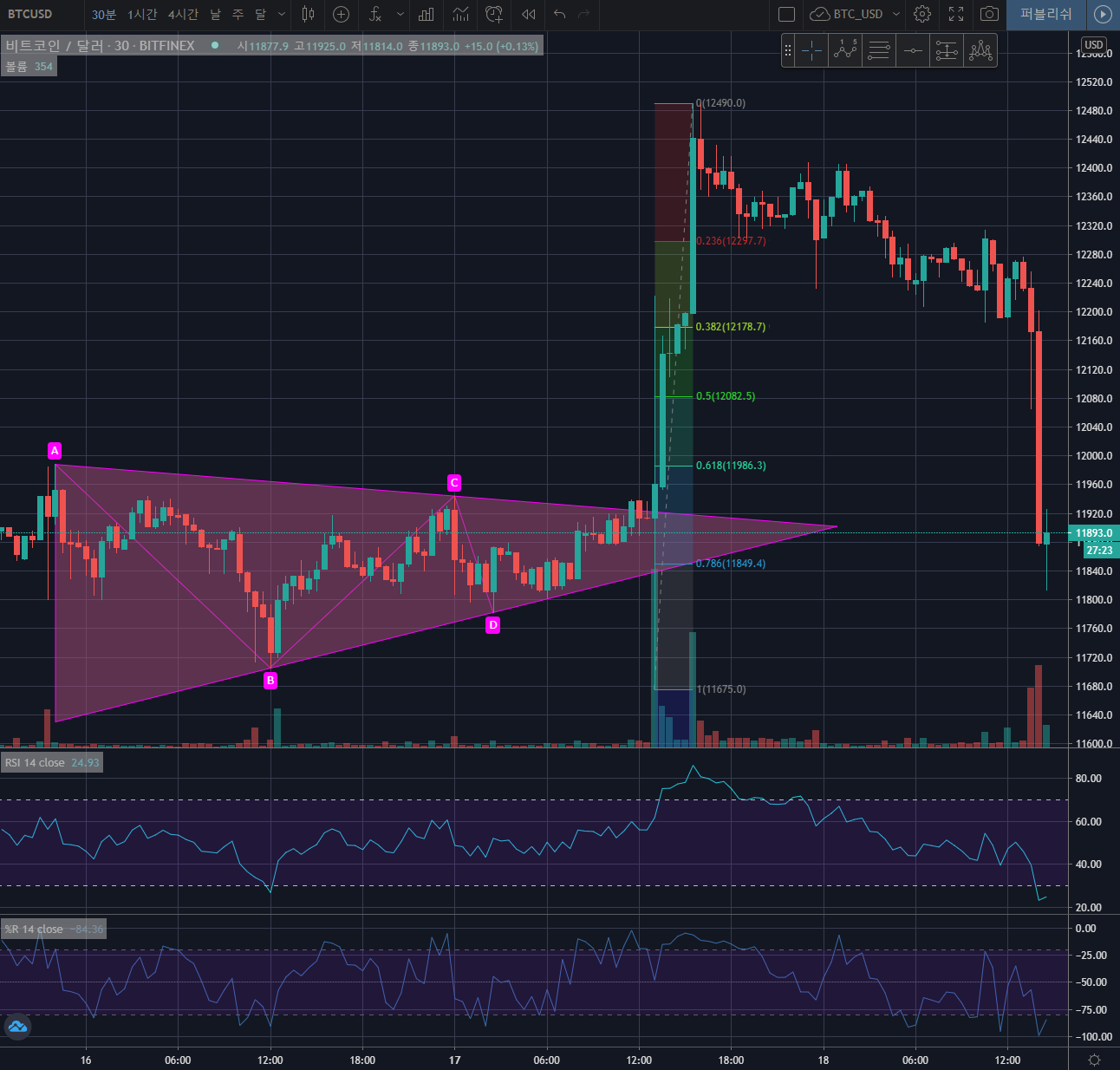 단타라고 말하기 무안하지만, 피보나치 돌림자리와 RSI 30분봉을 보고 700만원어치 팔았다 사보았다. 목적은 코인개수 늘리기겠지? 12K가 쉽게 무너졌지만, 11,986달러에서 돌림자리였으니까 12K 아래로 쉽게 내려가는게 당연하다고 봐야 하나...
