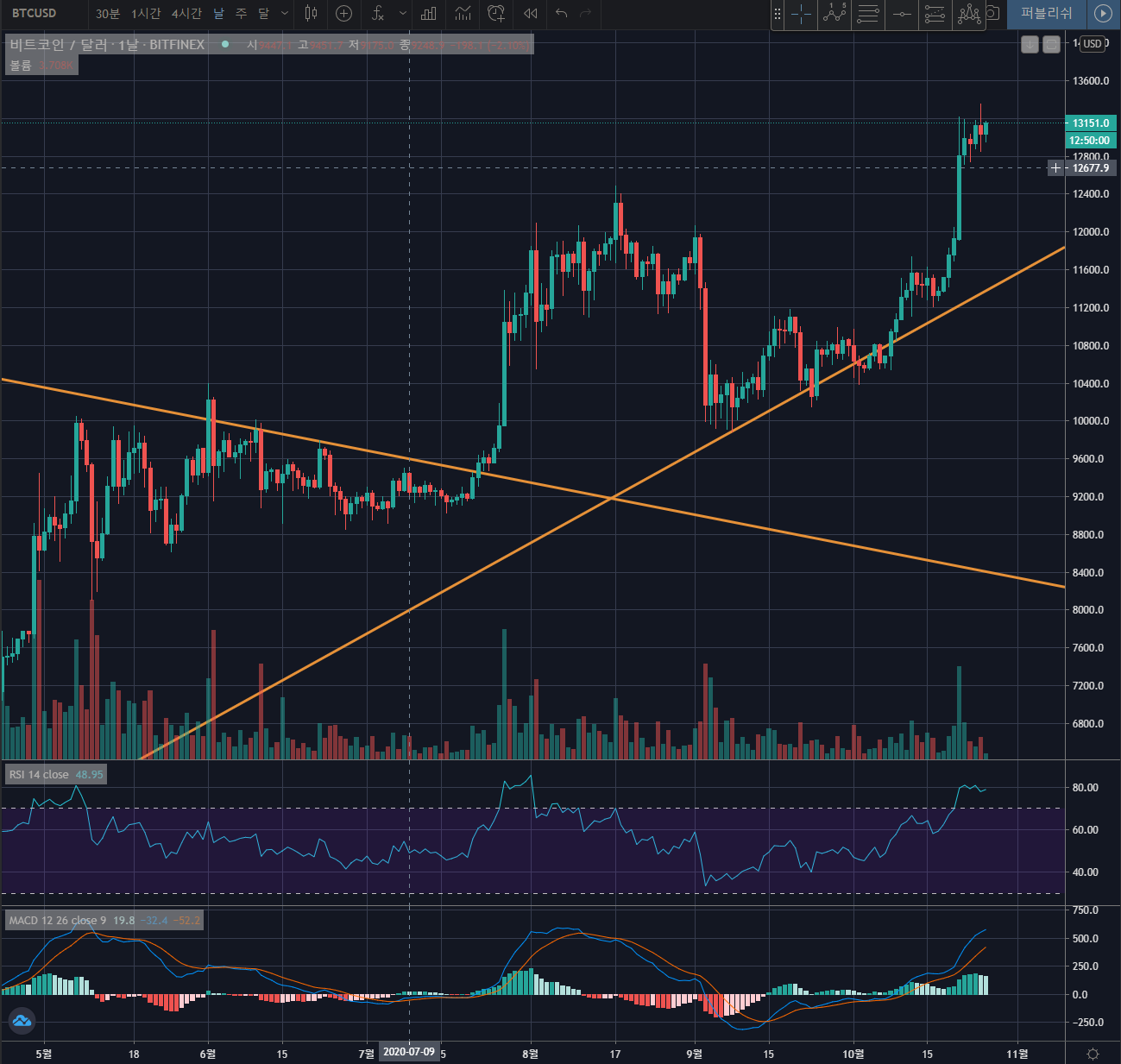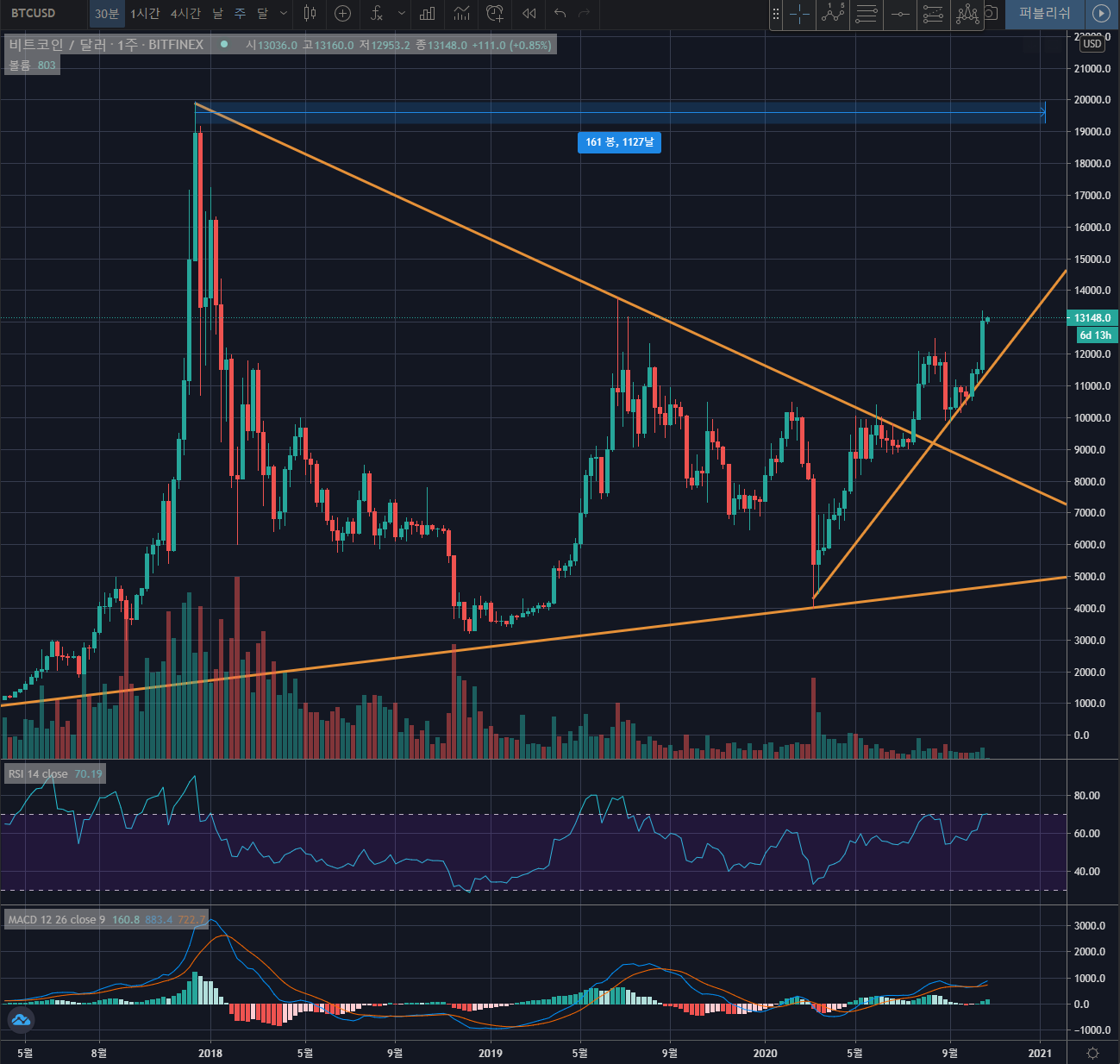 바로 전 포스팅에 주봉으로 161봉 역사를 봤는데, 현재 기준으로는 내년 1월 초에 그 시점이 온다. 즉, 2만불 터치가 내년 초에 오면 참 좋겠다라는 희망을 갖아본다. 여전히 손익 구간이나 지금까지 존버한 이유는 투자금의 100%가 아니라 더 높기 때문인데... 과연 탐욕이 나의 재테크를 망하게 할려나... 일단 주봉 관점에서 큰 추세선을 지켜줬으면 한다.